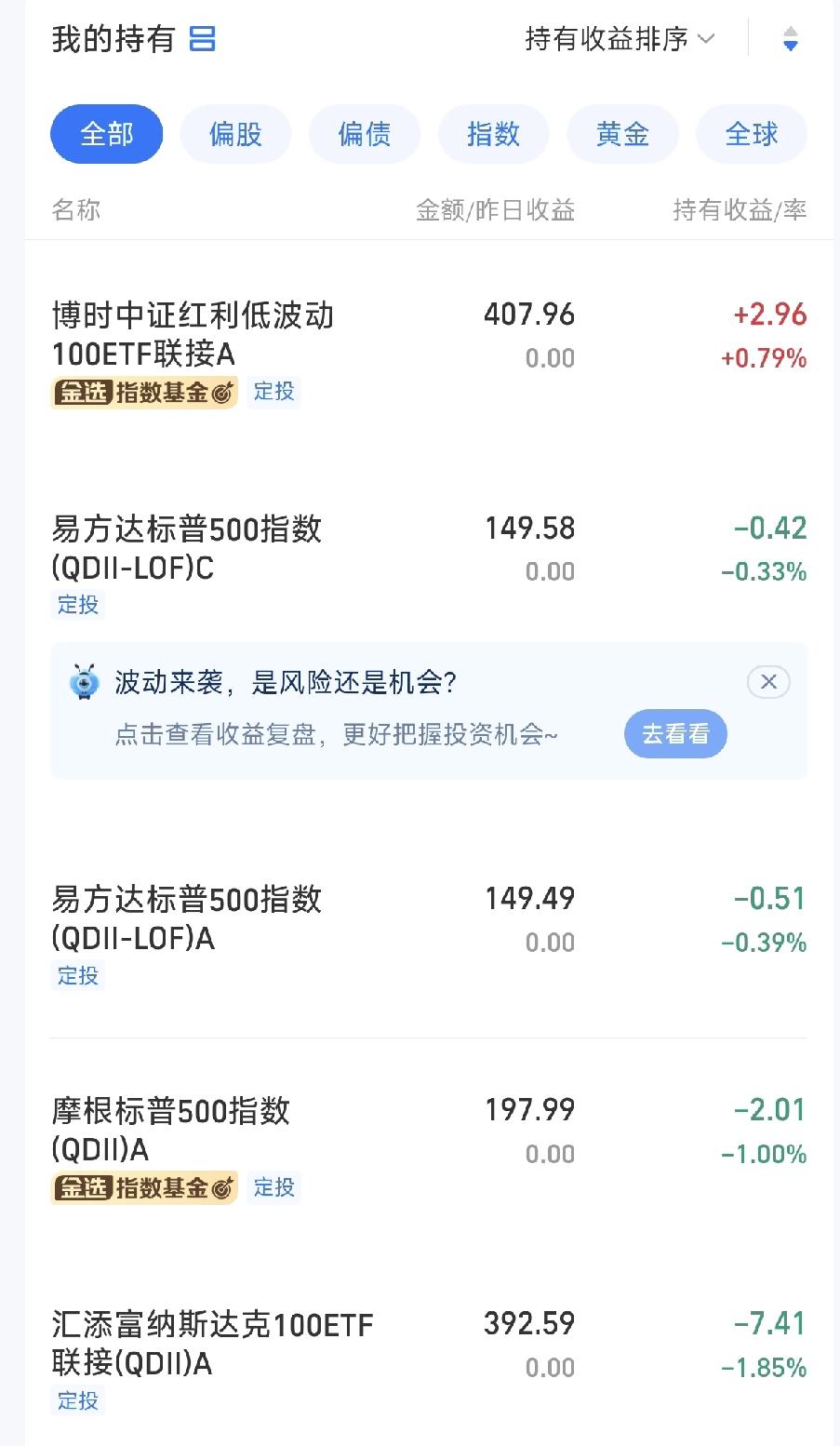 开始定投一个月了,每个月定投1500,有红利低波、标普500、纳指100等几个基