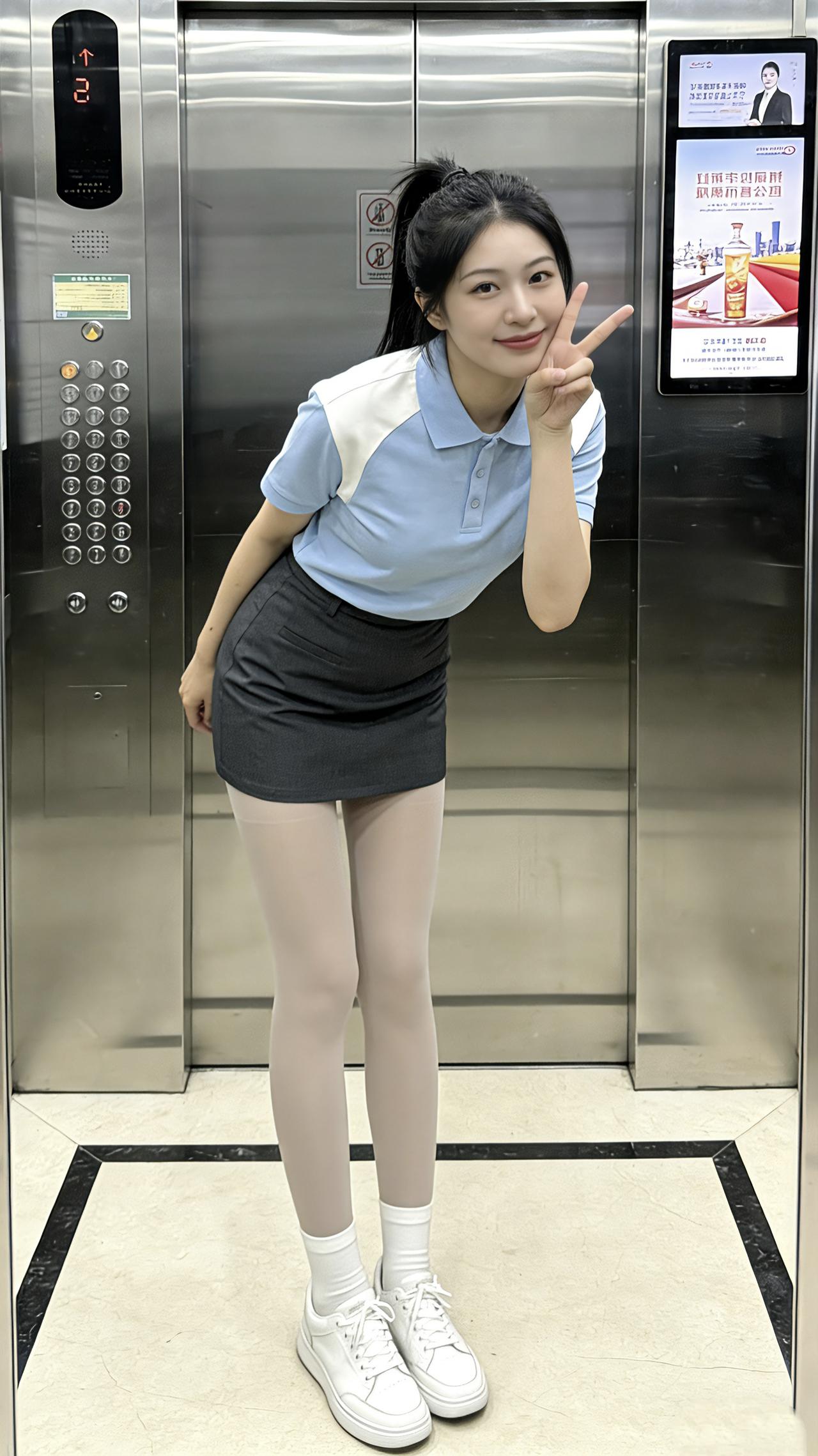 蓝白拼色Polo衫自带校园滤镜,配灰短裙利落显腿长 搭白袜小白鞋,电梯间随手拍都