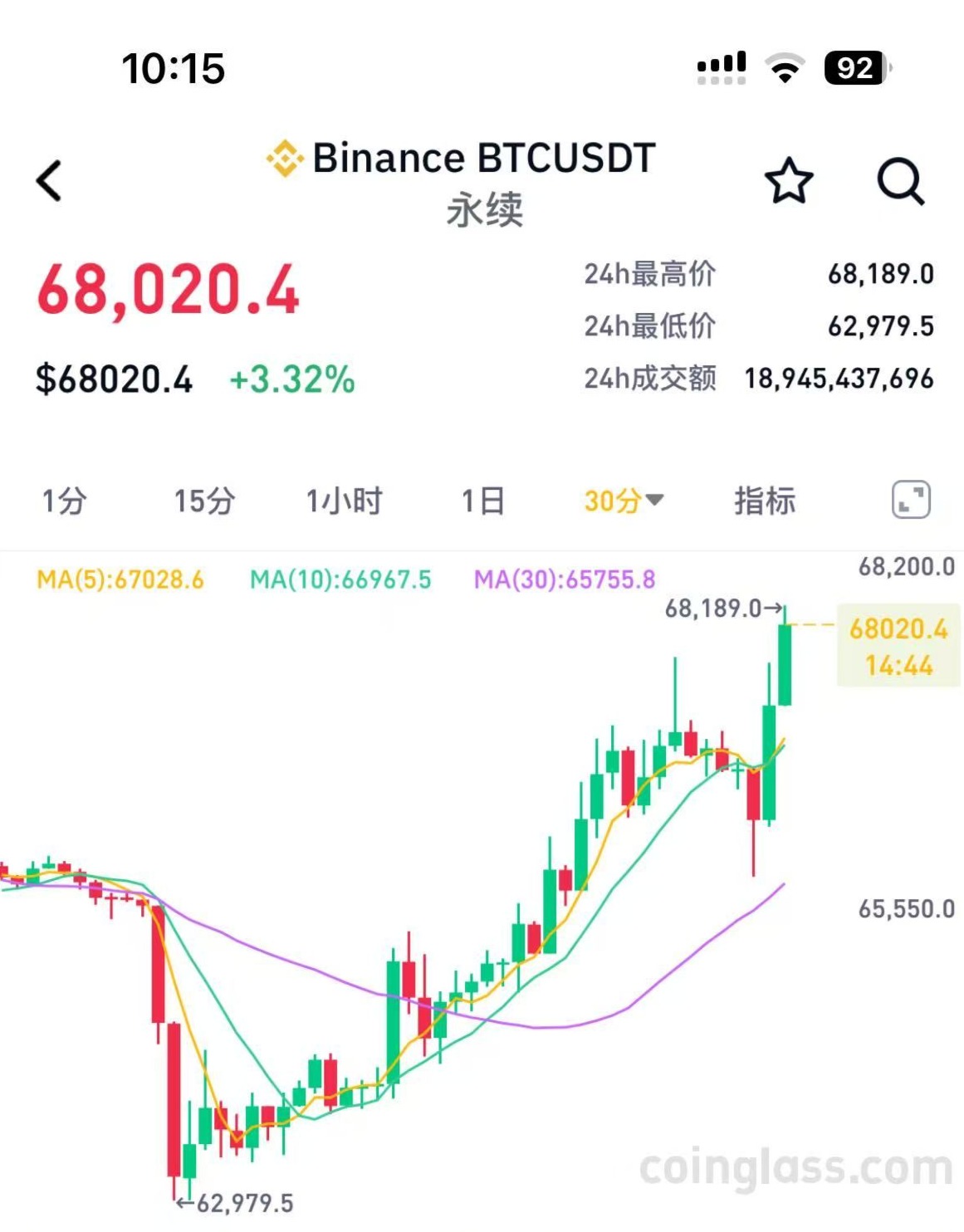 受地缘紧张影响,虚拟货币市场28日一度出现恐慌性抛售,比特币跌破63000美元。但市场随后企稳回升,最新行情显示,比特币最高涨至68189美元,较24小时低点62979美元反弹7.64%。