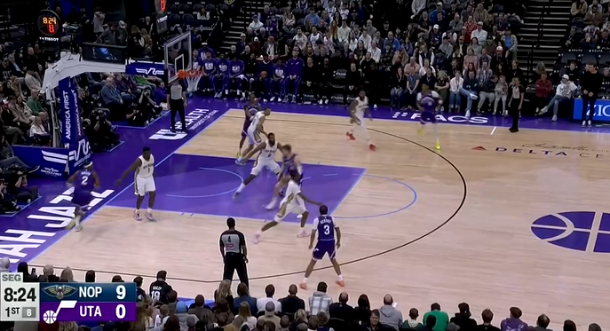 第一节,萨迪克-贝独得8分&爵士8中0,鹈鹕开局9-0领先爵士。