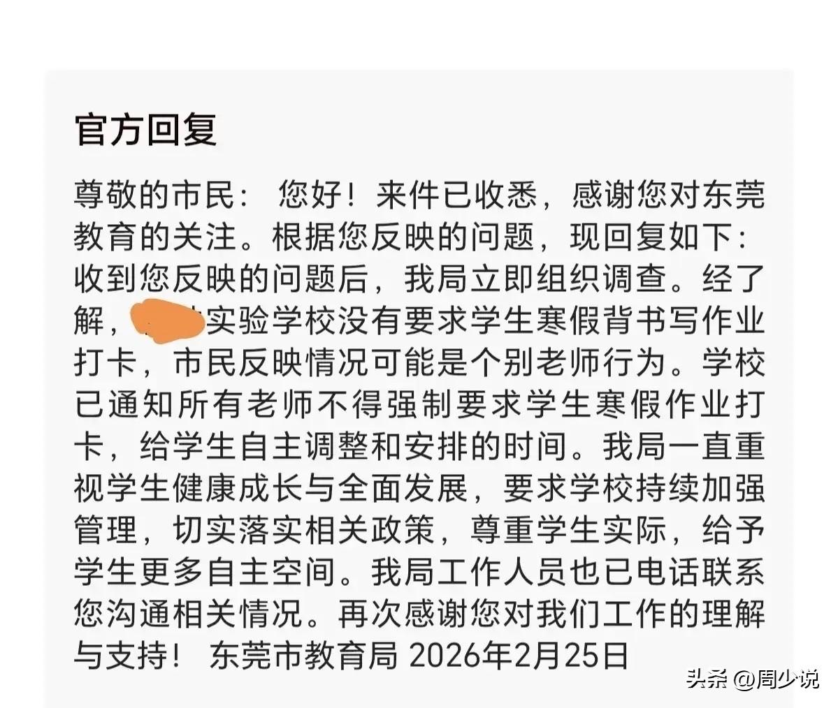 “怒赞教育局!”近日,东莞一名学生的实名举报,悄悄登上了家长圈热搜。这位学生自述,平时在校从早六点半学到晚十点,本盼着寒假能喘口气,可东莞实验学校却要求,整个假期每天必须背书、写作业、按时打卡,几乎把休息时间全部占满,身心始终绷在一根弦上。孩子无奈之下,只能向教育局求助,希望能落实双减,拥有一点属于自己的自由时间。 让人意外的是,官方仅用14天就给出了明确的回复:“经核查,学校并未统一要求打卡,问题大概率出在个别老师身上,现已全面明令禁止强制打卡,把时间还给孩子”。 此事在网上传开后,瞬间引发热议。不少网友纷纷表示:“终于有人敢站出来说真话,假期不是换个地方上课,双减不该停在表面”。 还有网友更是夸赞:“学生敢说、教育局敢管,这才是双减该有的样子”。 其实看完整个流程,周少不得不说心里还挺欣慰的。可以说,双减走到今天,不少学校和老师依旧会陷入“怕掉队”的焦虑,偶尔出现一些过度要求,似乎也在所难免。 可见,真正的减负,不只是停留在纸面上,更需要有人敢发声、有人快落实。给孩子适度的学习任务很有必要,但紧绷的状态很难长出健康的灵魂。 当然,也别忽略了孩子们的身心节奏,不妨多给孩子一点松弛感,让学习和休息找到平衡,可能比机械的打卡更有意义。 教育的初心,从不是一味紧绷,逼孩子不停奔跑,不妨多给孩子一点松弛感,让学习和休息找到平衡,让他们愿意走、走得远,可能比机械的打卡更有意义,这才是教育该有的温度。 对于这样的情况,大家怎么看呢?#寻美三湘# #周少说教育#