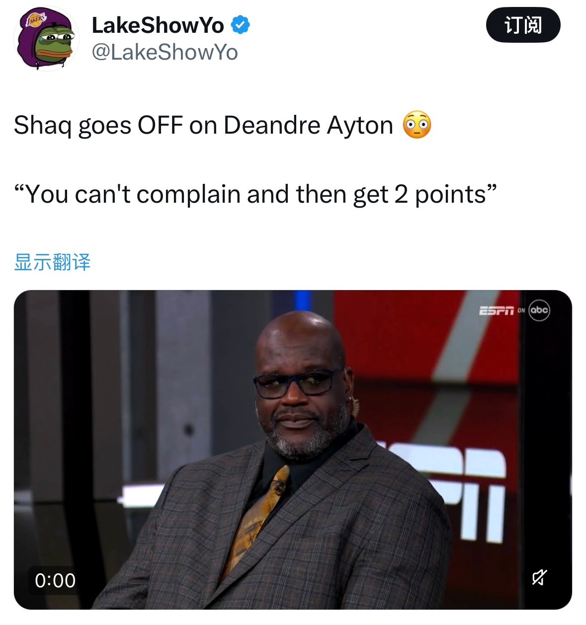 奥尼尔在线批评艾顿:“你不能一边抱怨,一边还只拿到2分。”湖勇大战湖人vs勇士