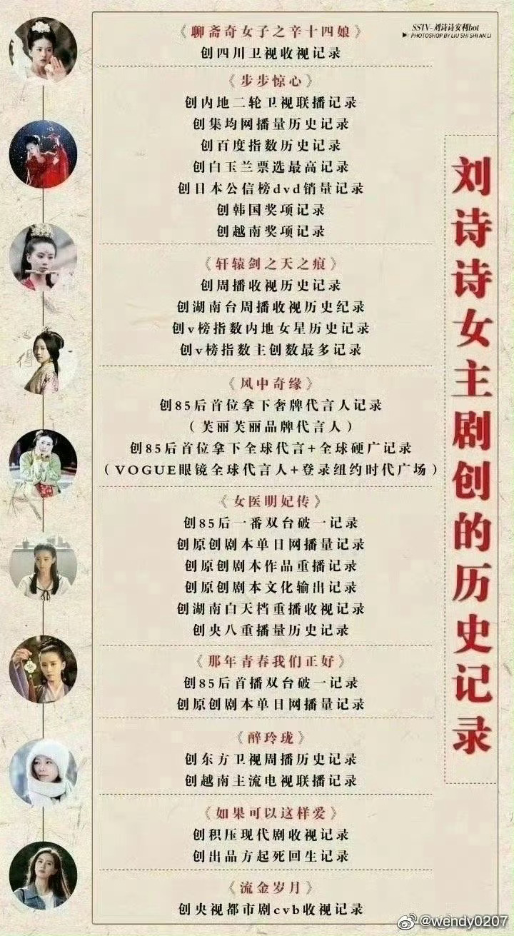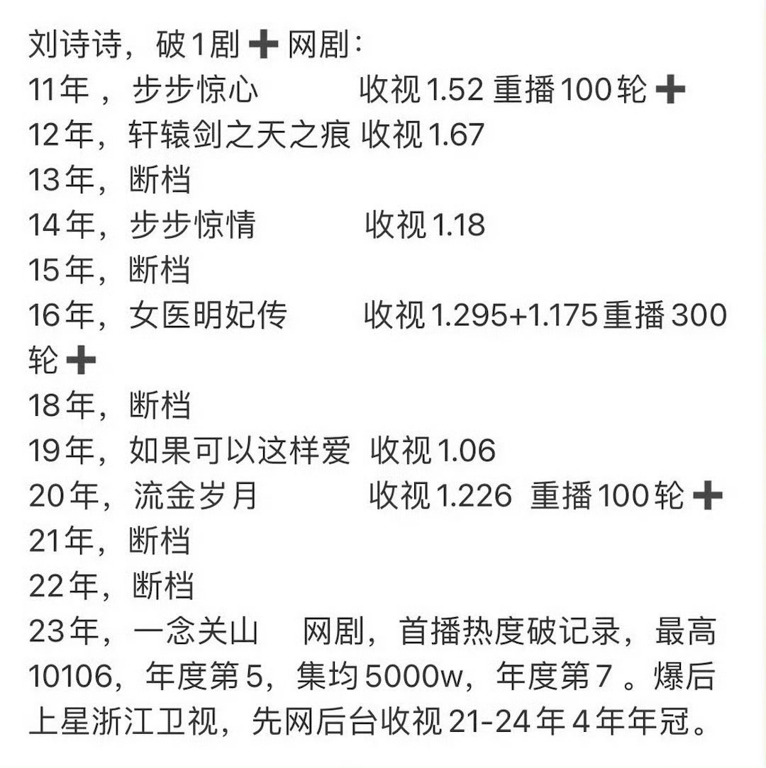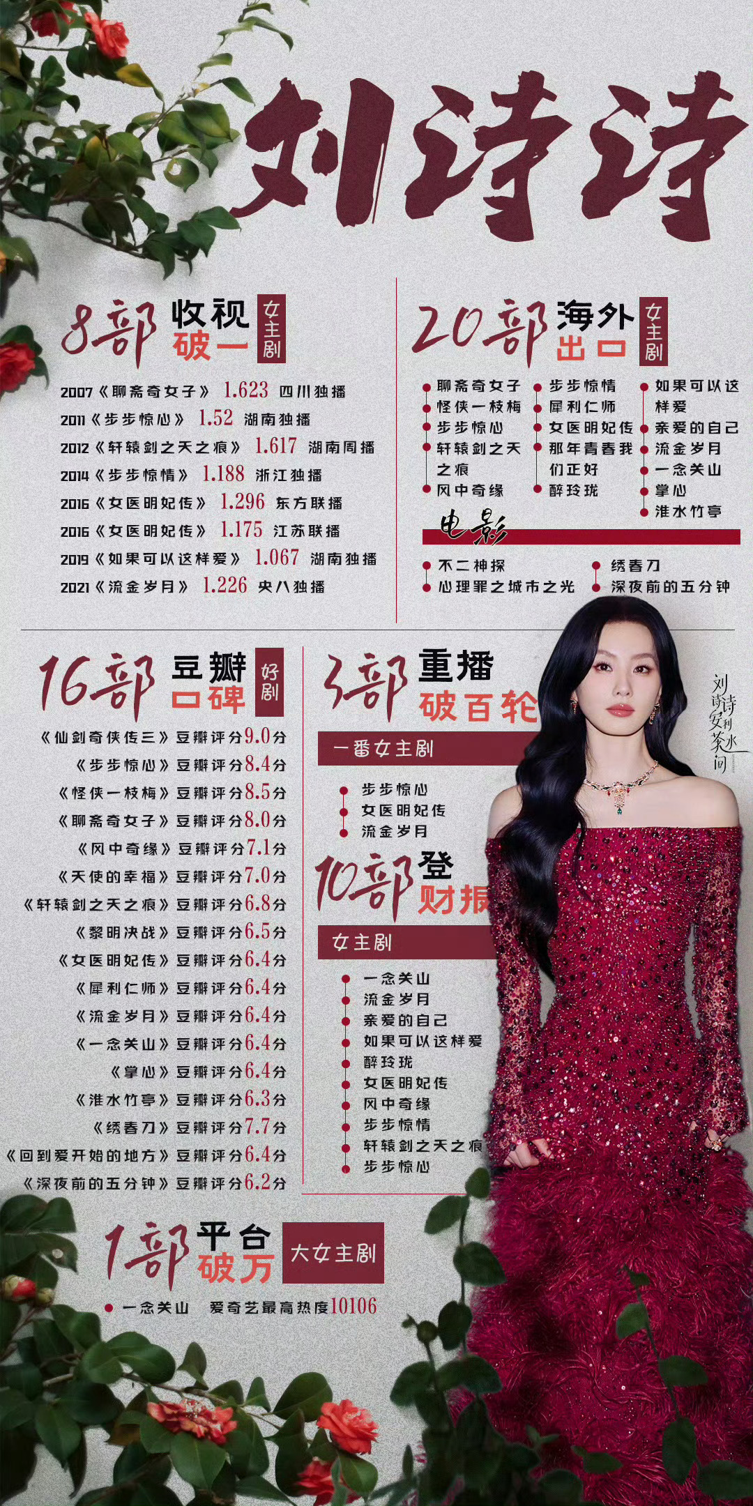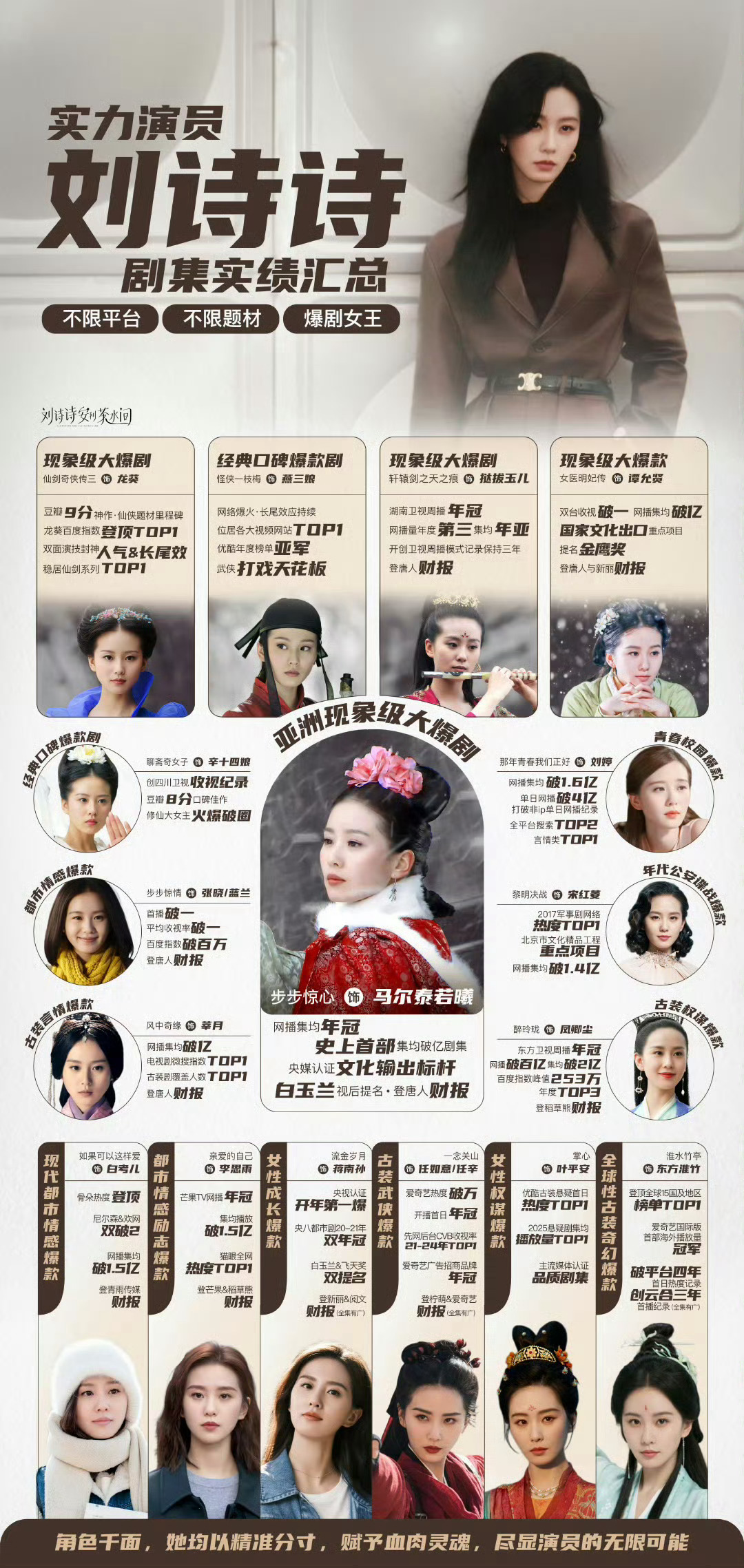 刘诗诗 影视,商业,奖项Ai总结:1. 收视女王:8部女主剧收视破1,覆盖卫视与央视,双台联播、周播档均创纪录,是85后少有的“收视保障”。