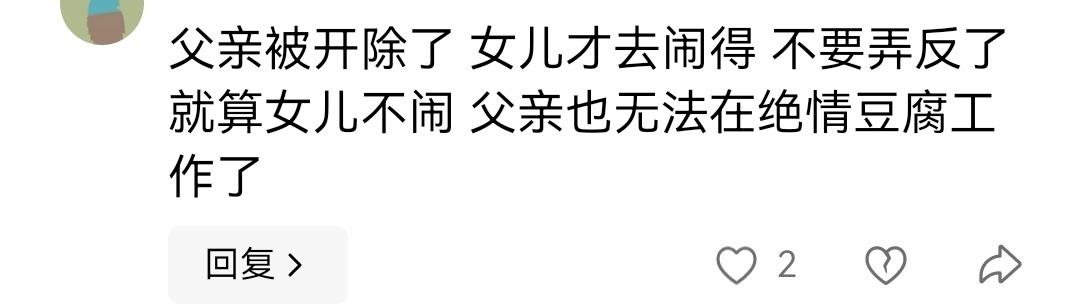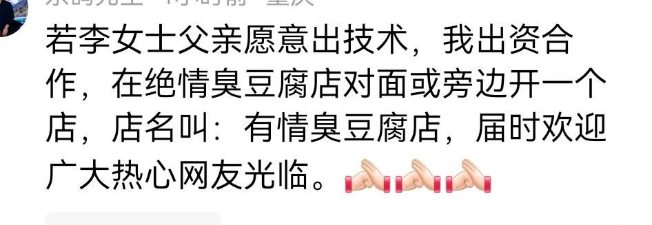 李女士想帮父亲请假两小时吃个团圆饭,却不料被开除。事件在网上发酵后,店老板不得不公开道歉,并补上离职补偿。 本来这是一件大快人心的事情,可是网上还有人骂李女士自私。真可笑,这件事李女士一点错没有,还有维权意识,很棒。 当然更多人是点赞李女士。 也有人表示担忧,觉得李女士父亲年纪大了,很难找到工作,出了这么个事情,也没人敢要他干活了。 这个人是什么脑子?太没见识了。我觉得李女士一家机会来了。 李女士父亲可以自己开一家臭豆腐店,已经有人愿意出资和李师傅合作了。 李师傅是干了那么多年的炸锅师傅,技术过硬,只要保证质量,价格公道,趁这波流量,做大做强。李女士都可以不再打工,继承父亲衣钵。 李女士,你一定行的,支持你!