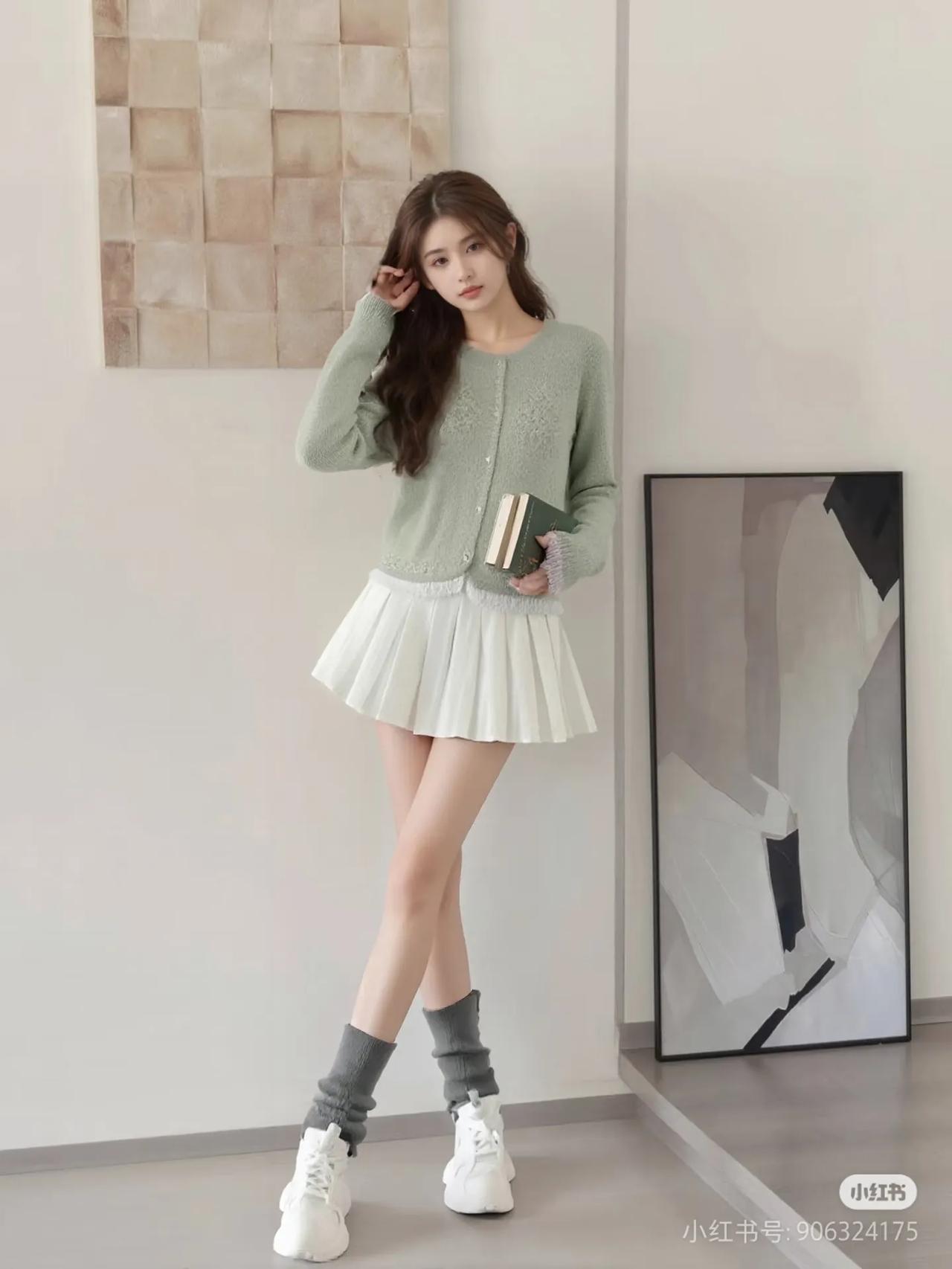 清新校园风穿搭,绿毛衣+白短裙,青春活力满满!街拍 高清美女