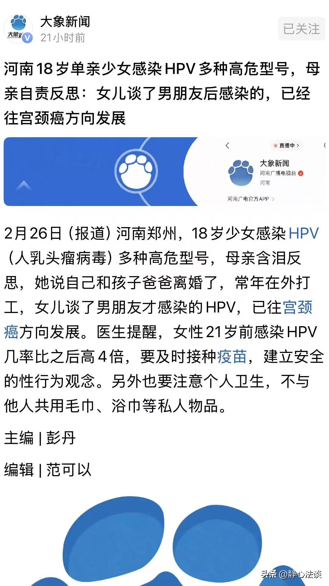 “别拿身体赌爱情!”河南郑州,18岁女孩早恋,和男友发生关系,没想到,竟然感染了多种高危HPV病毒,宫颈已经病变,差一点就是宫颈癌,远在外地打工的母亲得知后,急忙赶回来带女儿去医院治疗,母亲感到无比后悔,她怎么也想不到,离婚自己带女儿的这些年里,自己远走他乡拼命赚钱,就想给女儿铺一条平坦的路,怎么到头来,却让孩子发生这种事,早知道就不出去打工了,可现在后悔已经为时已晚! 刘大姐早年离婚,常年外出打工,把18岁的女儿留在老家上学。 那天突然接到女儿的电话,却让刘大姐崩溃不已! 电话那头,女儿哭的稀里哗啦,颤抖着告诉妈妈,自己下面一直流血,疼得直不起腰……。 刘大姐脑子嗡的一声,什么都没问,说别怕,妈妈这就回家。 她顾不上跟老板请假,抓着包就往车站冲,一路攥着手机,指节都掐白了,眼泪糊了满脸。 赶到家时,18岁的女儿蜷缩在沙发角落,脸色惨白得像一张纸,下身的红色痕迹刺得人眼睛生疼。 女孩不敢抬头看母亲,头埋得低低的,肩膀一抽一抽地抖,恐惧和羞愧把她裹得喘不过气。 刘大姐一句话没说,一把拉起女儿就往医院赶去。 排队、挂号、检查,每一分钟都漫长得像一个世纪。 诊室门外,女儿死死咬着嘴唇,眼泪无声地砸在鞋面上。 她不敢回想那几个月的荒唐,自己懵懂地谈了恋爱,以为那就是掏心掏肺的喜欢,稀里糊涂就交出了自己。 她不懂什么是保护,更不知道危险正悄无声息地缠上她。 直到身体频频报警,小腹坠痛、莫名出血,她才慌了神,却又怕母亲担心,硬扛着不说。 等检查完事,医生把检查报告单递过来时,刘大姐的手瞬间僵住。 多种高危型HPV感染,宫颈已经病变,再晚一步,就是宫颈癌。 这一行字,像一把重锤,狠狠砸在母女俩心上。 刘大姐腿一软,靠在冰冷的墙壁上,眼泪决堤般往下掉,却不敢哭出声。 她没有骂女儿一句,只是一遍遍地捶着自己的胸口,无声地崩溃。 她后悔,如果自己不出去打工,如果陪在女儿身边,是不是就不会发生这样的事。 看着母亲崩溃的样子,女孩的心像被无数根针密密麻麻地扎着。 她终于忍不住哭出声,悔恨像潮水一样将她淹没。 她才18岁,本该是在阳光下笑闹、对未来满是憧憬的年纪,却因为一时的懵懂无知,把自己拖进了黑暗里。 医生告诉她们,18岁的宫颈太娇嫩了,抵抗力根本跟不上。 21岁之前发生亲密关系,感染HPV的概率直接翻四倍,病毒很容易扎根,一步步拖成癌症。 不过还好发现得还算及时,治疗还有希望。可这份教训,太重太重了。 女孩躺在病床上,看着窗外的阳光,心里满是酸涩。 她知道母亲外出打工,全是为了这个家,为了能让她过得好一点。 可她偏偏在最需要陪伴和引导的时候,走偏了路,让母亲跟着一起承受痛苦。 现在的她,只想快点好起来,不再让母亲为她流泪。 《民法典》第26条:父母对未成年子女负有抚养、教育和保护的义务。 女孩事发时未满18周岁,属未成年人,母亲因外出务工疏于陪伴与性安全教育。 未完全履行法定教育、保护职责,即便为生计奔波,也不能免除监护责任。 《未成年人保护法》第16条:未成年人的父母或其他监护人应当关注未成年人生理、心理状况,进行生命安全、身心健康教育。 作为父母,必须主动开展自我保护与性健康引导,这是法定义务,而非可做可不做。 女孩的经历,也狠狠敲醒所有和她一样年纪的女孩。 千万别在不懂爱的时候随便交付自己,别拿身体赌爱情,底线守不住,毁掉的就是一辈子。 更想告诉所有在外奔波的父母:性教育从来不是羞耻事。 再难开口,也要早早教孩子保护自己,别等到遗憾发生了,才追悔莫及。 18岁的青春,本该是干净明亮的,可她的十八岁,却蒙上了一层永远擦不掉的灰。 现在只希望女孩能早日痊愈,也盼着所有女孩的青春,都能平安无恙,永远不用体会她此刻的痛与悔。 对此,你这么看呢? @静心法谈 学法辨是非,慬法不吃亏。