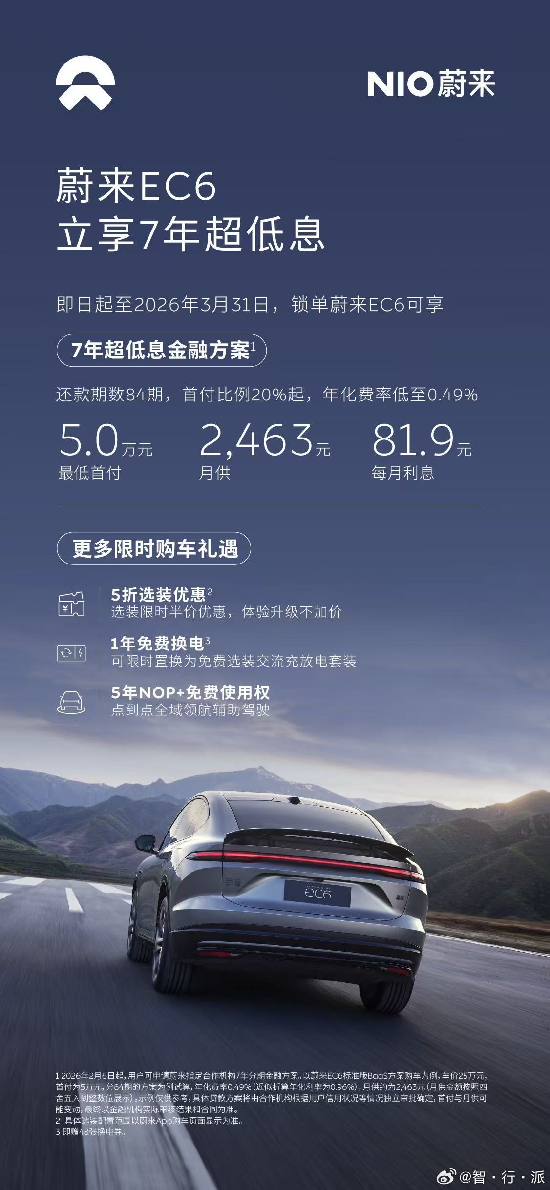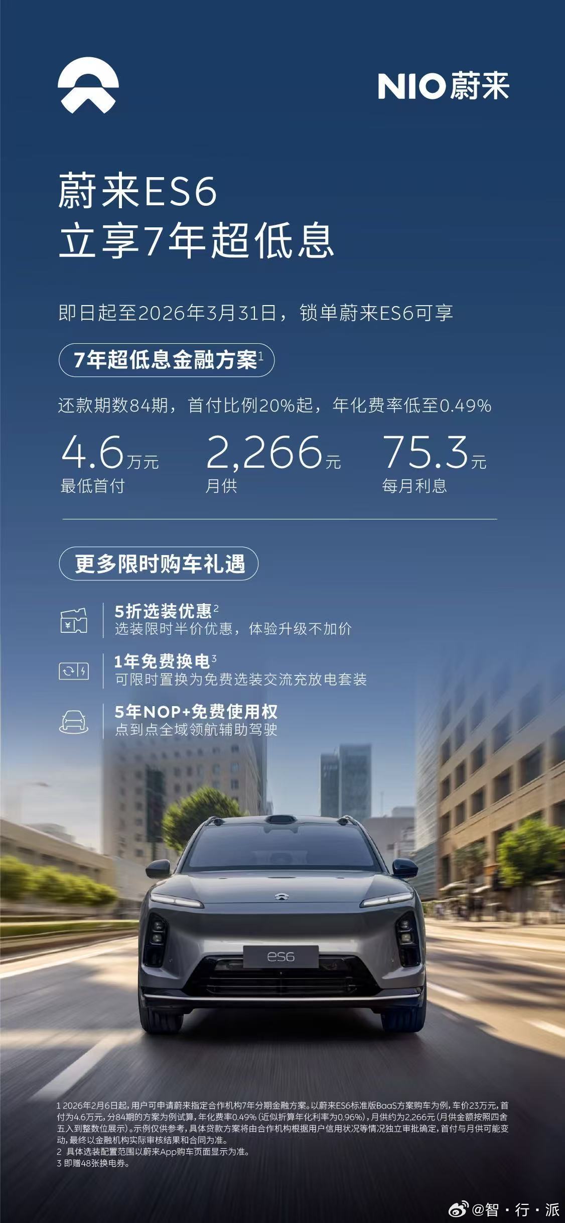 蔚来推出3月限时金融购车方案。即日起至3月31日,订购蔚来ET5、蔚来ET5T、蔚来ES6、蔚来EC6并成功锁单的用户,可享限时7年84期金融购车方案,首付低至20%起,年化费率低至0.49%。采用BaaS电池租用方案购车,首付低至3.8万元起,月供低至1,872元起,每月最低利息仅62.8元。蔚来ET5、ET5T、ES6、EC6车型现已全系标配100kWh长续航电池包,采用BaaS方电池租赁方案购车,不仅轻松降低10.8万元购车门槛,也彻底告别了电池寿命的焦虑。结合7年84期超低息的金融购车方案,不仅低首付、同时还有更低月供和超低利息,提前还款0违约金、0手续费,让金融购车做到真正的0套路。旨在让更多用户可以更轻松地拥有蔚来领先的智能纯电出行体验。即日起至3月31日,订购蔚来ET5、蔚来ET5T、蔚来ES6、蔚来EC6并成功锁单的用户更有丰厚购车礼遇可享,包括5折选装优惠、1年免费换电(可限时置换为免费选装交流充放电套装)以及5年NOP+免费使用权。购买蔚来ET5、蔚来ET5T的用户还可额外享受价值9,500元的适享套装免费赠送。