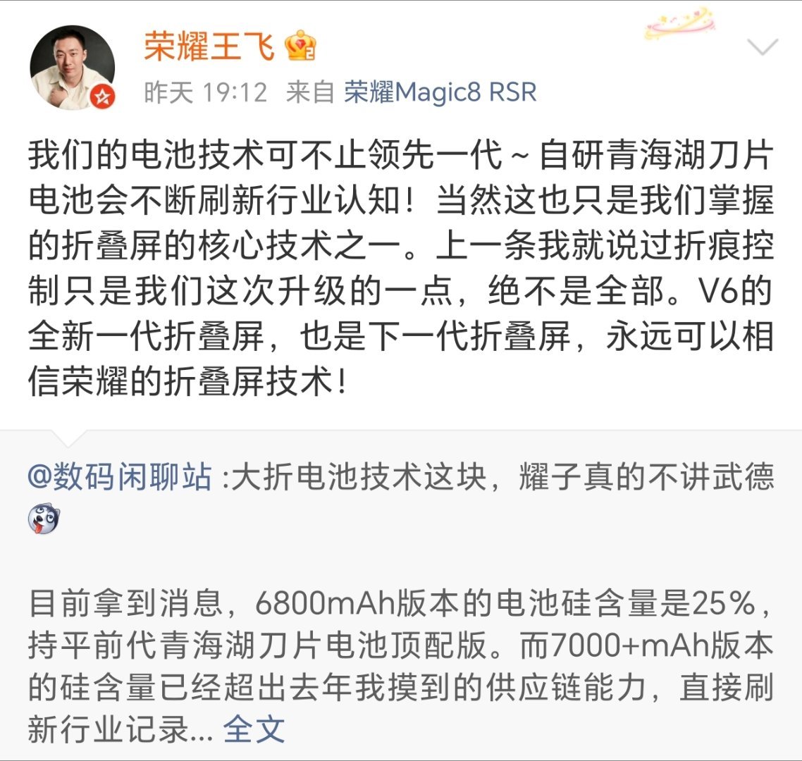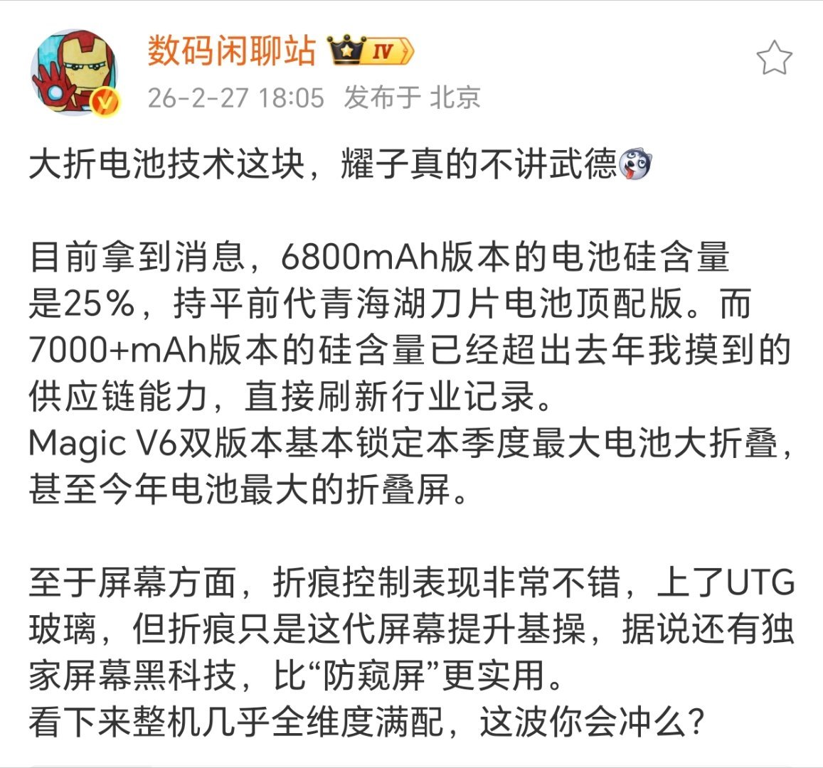 今晚Magic V6就要在巴塞移动通信大会发了。荣耀MWC2026前瞻了解一下V6,大折叠屏电子这块荣耀确实很给力,超薄青海湖电池,锁定本季最大电池折叠屏,UTG玻璃把折痕控制到极致,屏幕黑科技比三星“防窥屏”更实用。