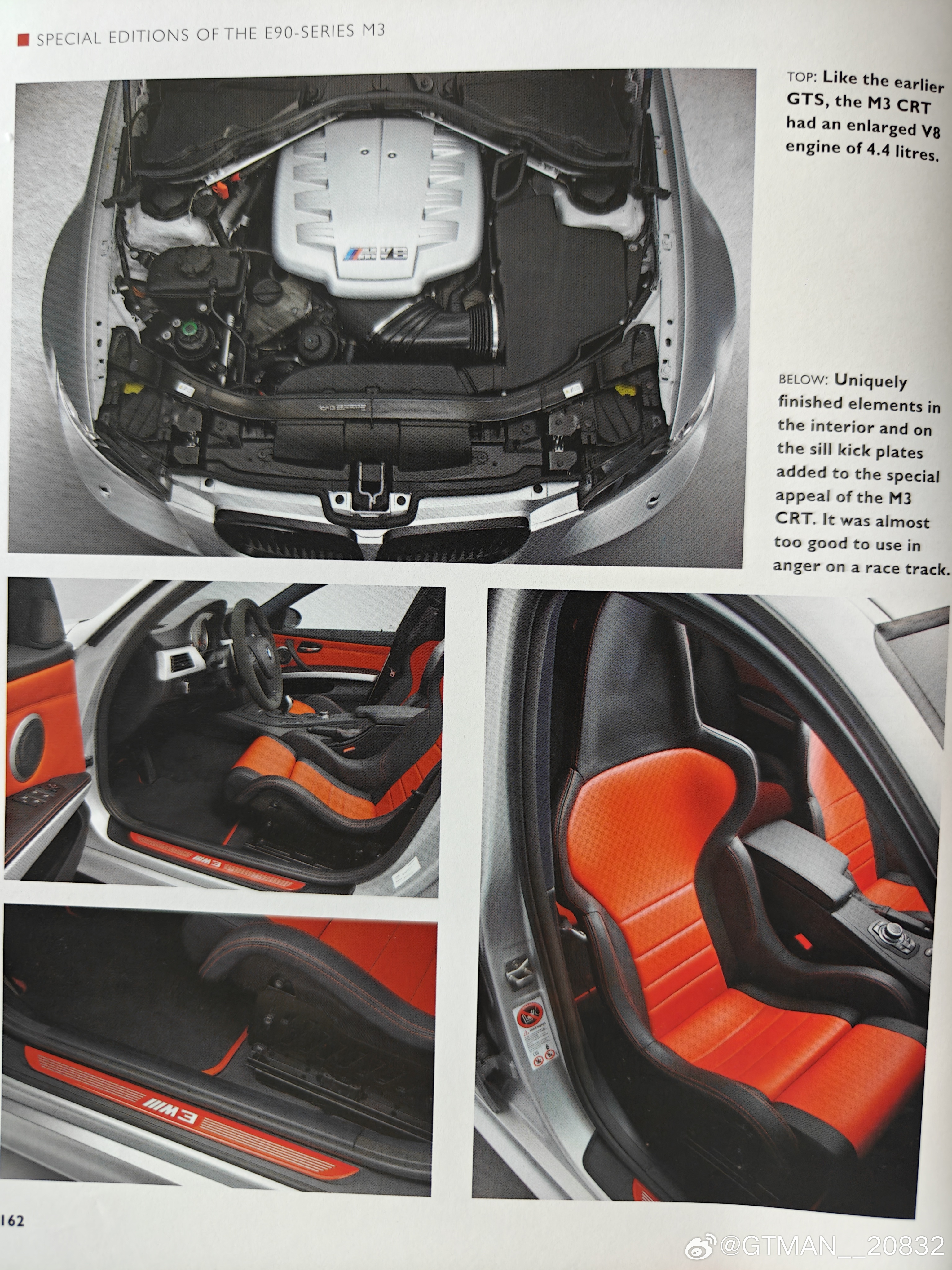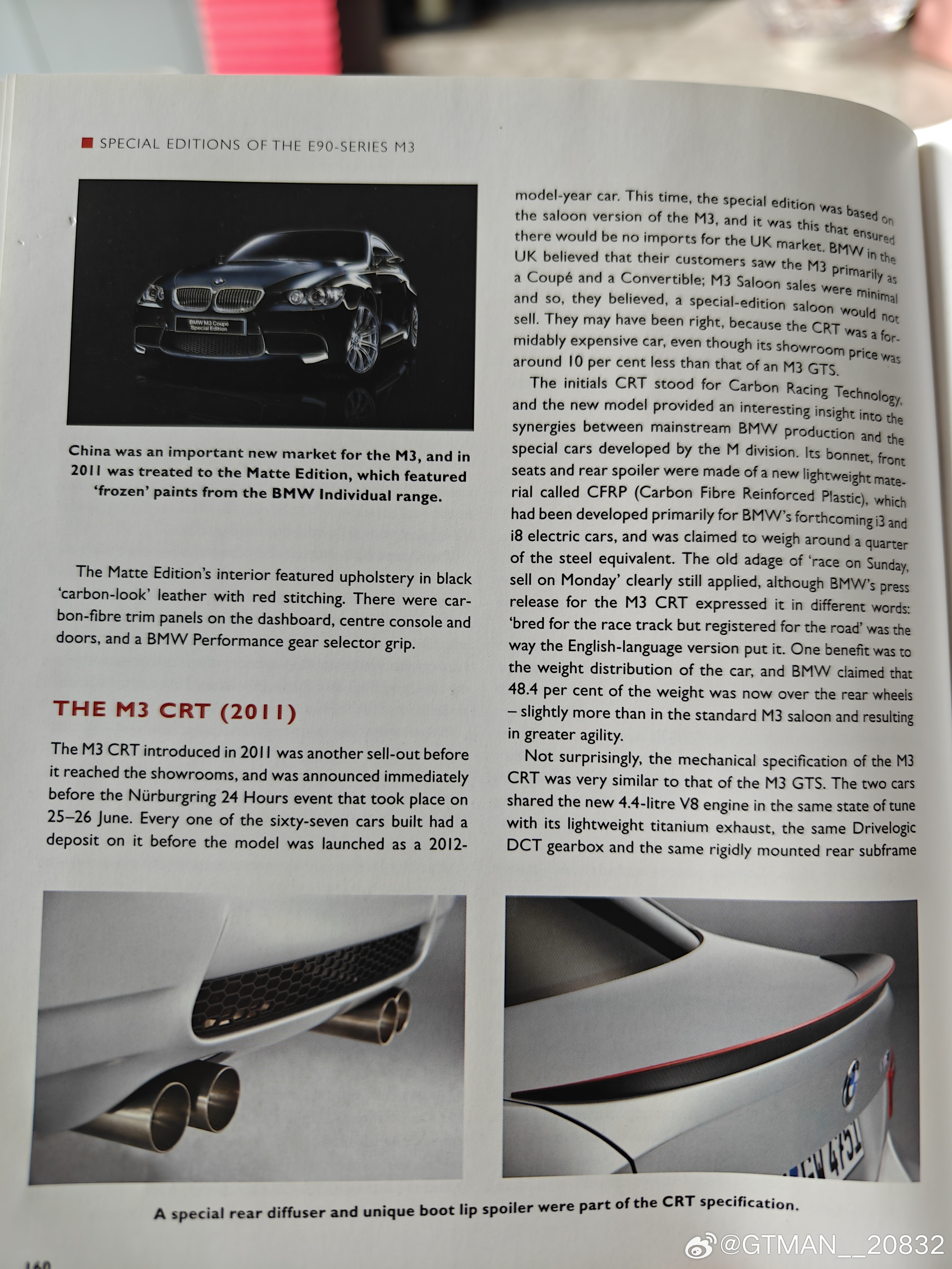 翻看老书看到一台被遗忘的超稀有M3,E90 M3 CRT ( carbon racing technology), 这台车可以看作是m3 gts的四门版,用同样一台4.4 v8,450 马力,整车减重70kg。比起gts 更加稀有,一共67台,二手市场10年前吧那时候差不多11-15w欧元,现在应该轻松能破20w欧。