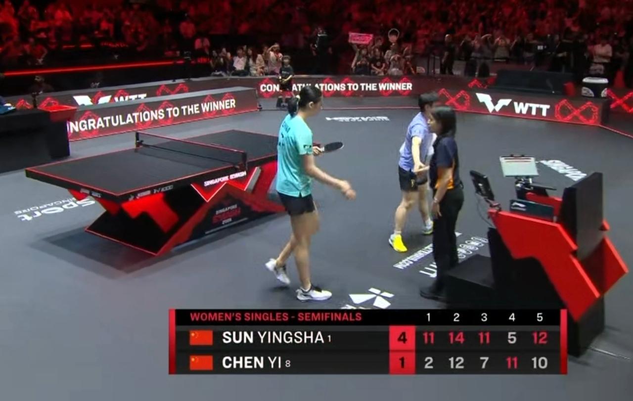 孙颖莎4-1战胜陈熠晋级决赛! 2026WTT新加坡大满贯赛 女单半决赛,头号种子孙颖莎以4-1力克队友陈熠,五局比分为11-2、14-12、11-7、5-11、12-10。 此役孙颖莎展现了强大的中远台相持能力和关键分把握能力,尽管陈熠在第四局和第五局末段顽强追分,但孙颖莎仍稳住阵脚,成功晋级决赛。 这是孙颖莎连续第二届闯入新加坡大满贯女单决赛,她将向个人第三座大满贯女单冠军发起冲击。陈熠虽止步四强,但作为新生代球员,她在本届赛事中先后淘汰多位强敌,表现可圈可点,未来值得期待。