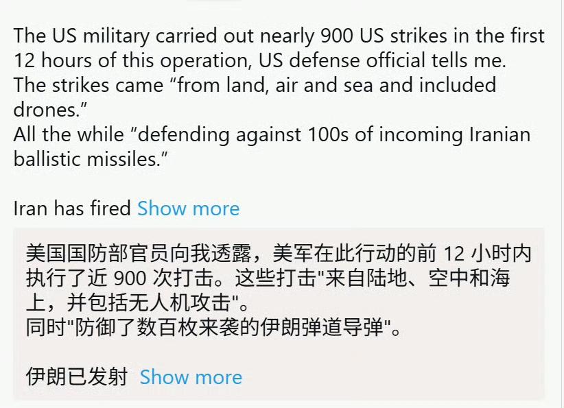 12小时发动900次空袭?国内的新闻抄国外也就算了,至少别抄二手的,抄一手新闻,抄的时候准确点啊。知道900次空袭是什么概念吗? 空袭,特指轰炸机空中袭击,导弹都不算空袭。 美军官方的原文是发动了900次打击,这打击就太容易掺水了。 被一个x上的反贼自媒体歪曲成900次空袭,结果国内媒体居然都跟着说是900次空袭。