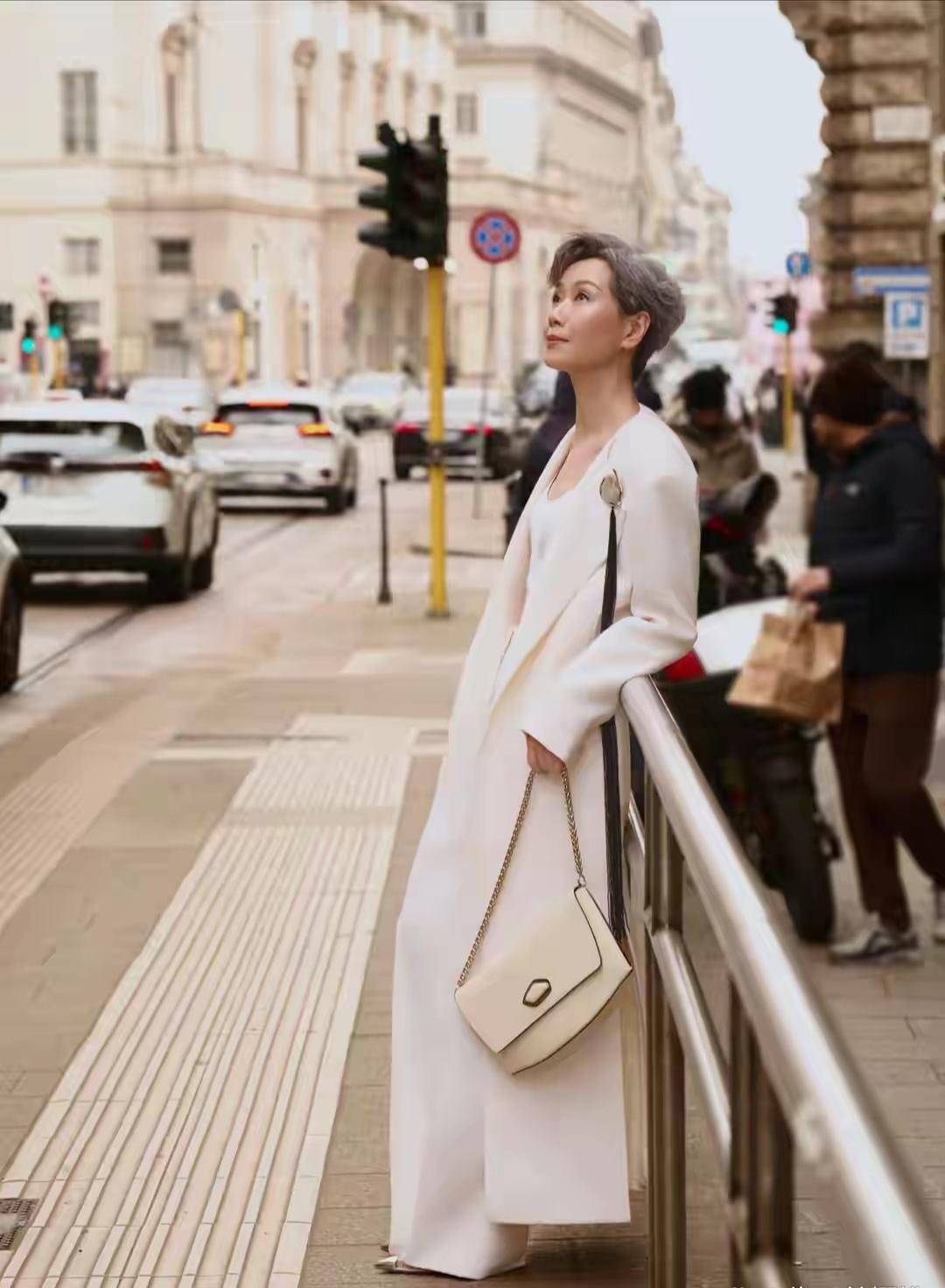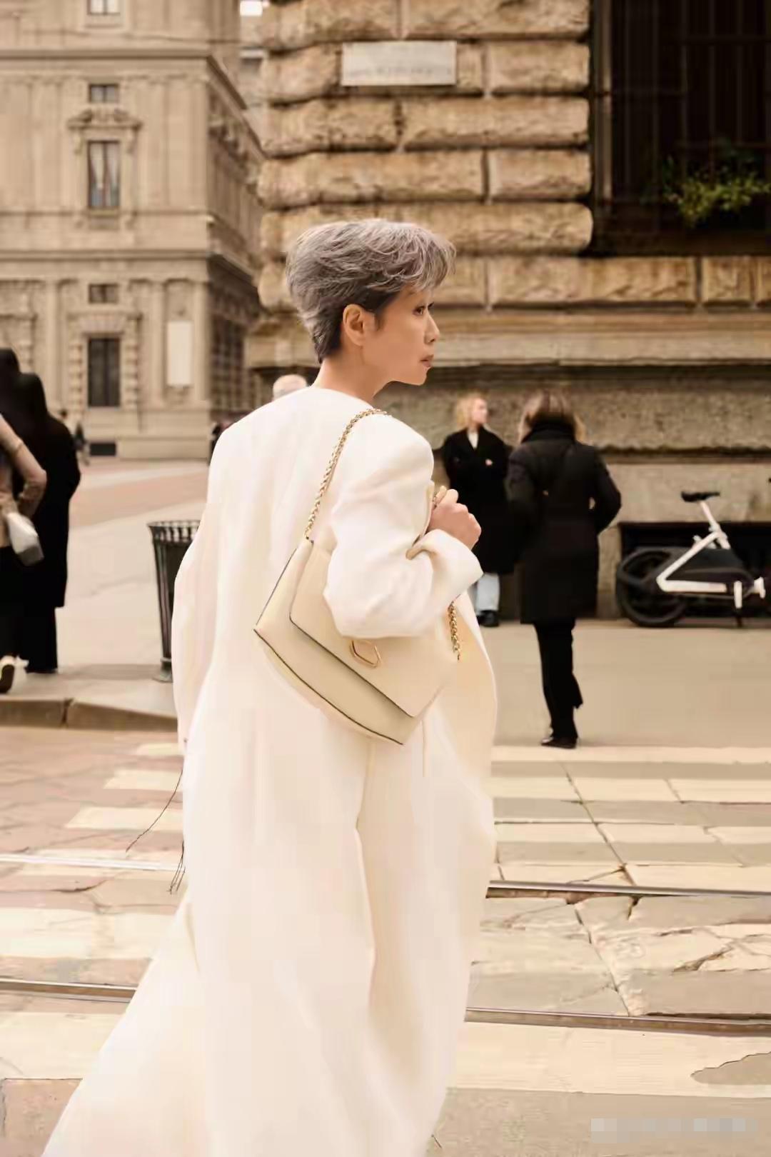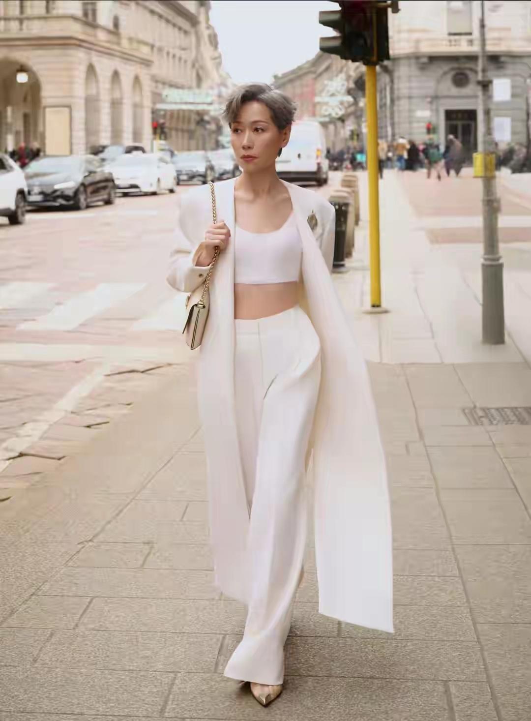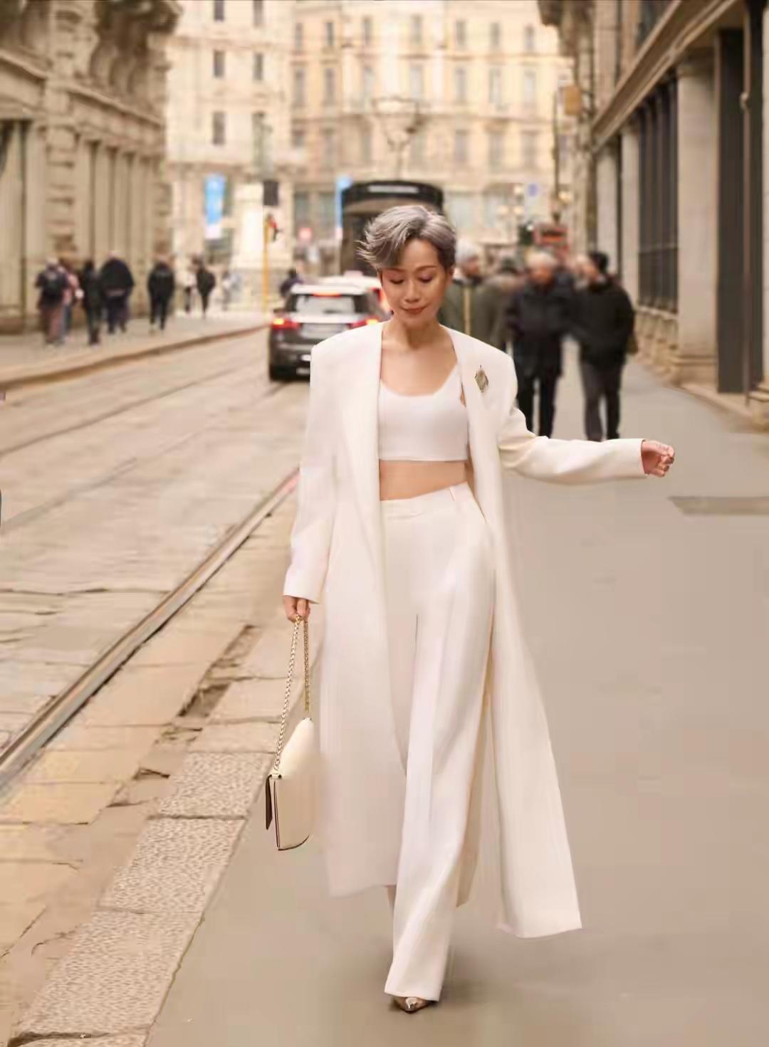 63岁的叶童在米兰街头杀疯了!一身全白西装套装,内搭短款背心,还巧妙露出腰线,显瘦又不失力量感,减龄时尚高级,气场全开,利落的短发造型更添干练气场,太喜欢这种不费力的高级感了,这哪里是看秀,分明是把秀场穿在了身上,松弛感直接拉满,从容自信的神态与挺拔身姿,完全看不出年龄感,完美诠释成熟女性的时尚魅力。