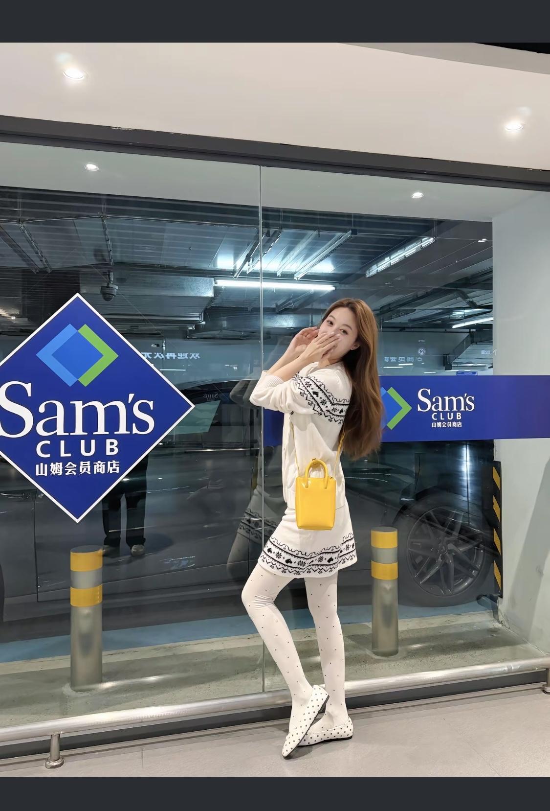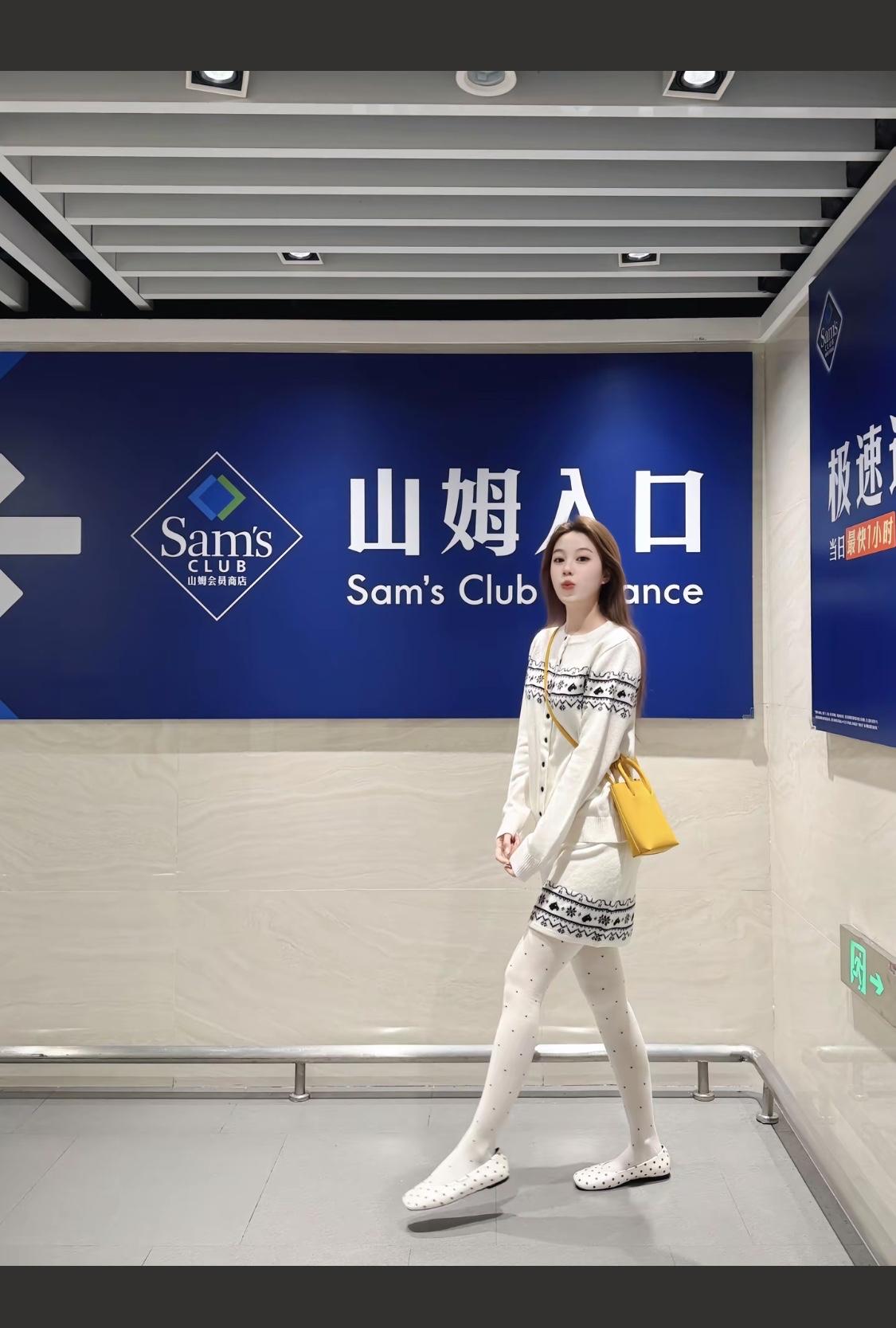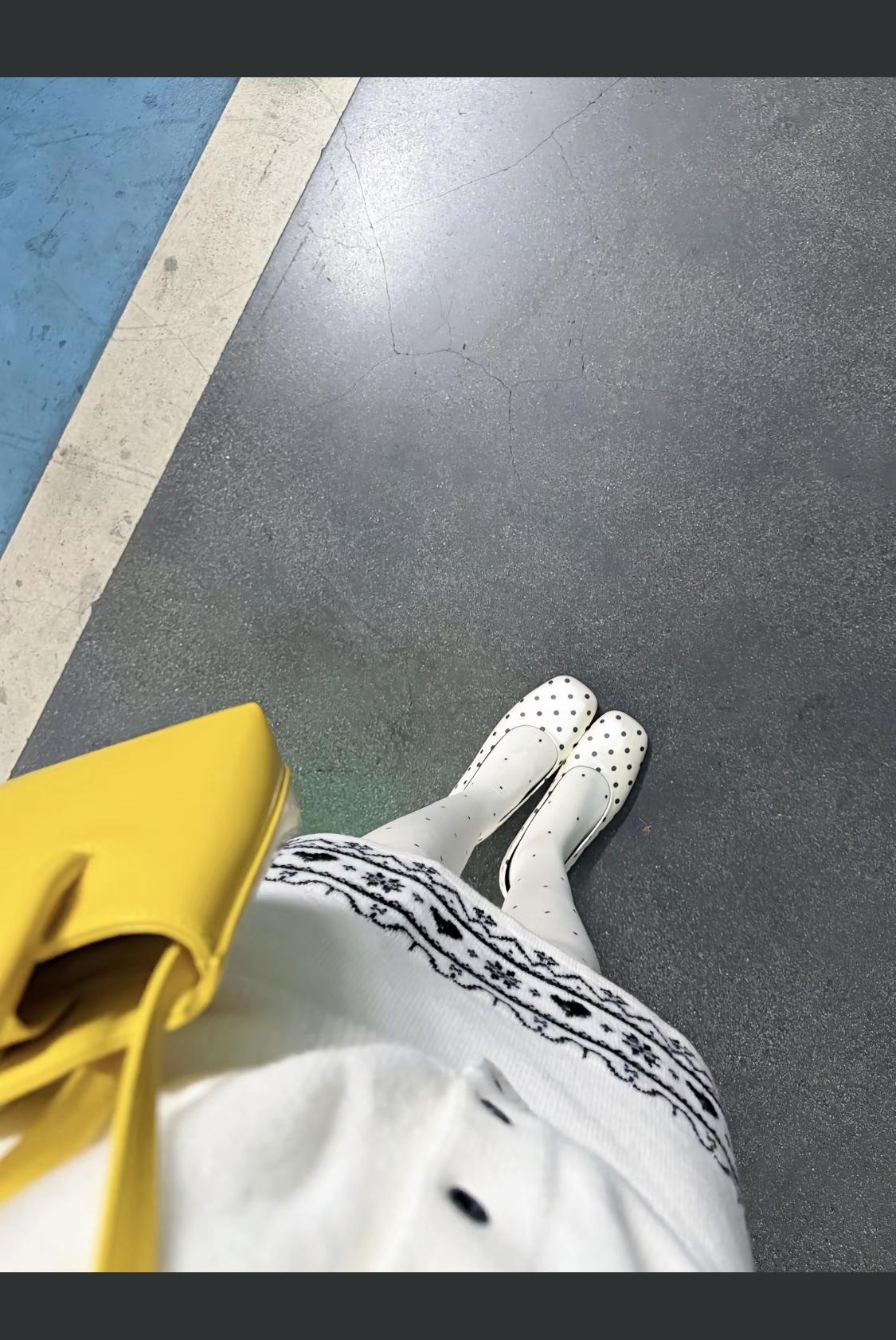黑白波点鞋搭配白色连衣裙,简约优雅,黄色包包点缀,完美造型!