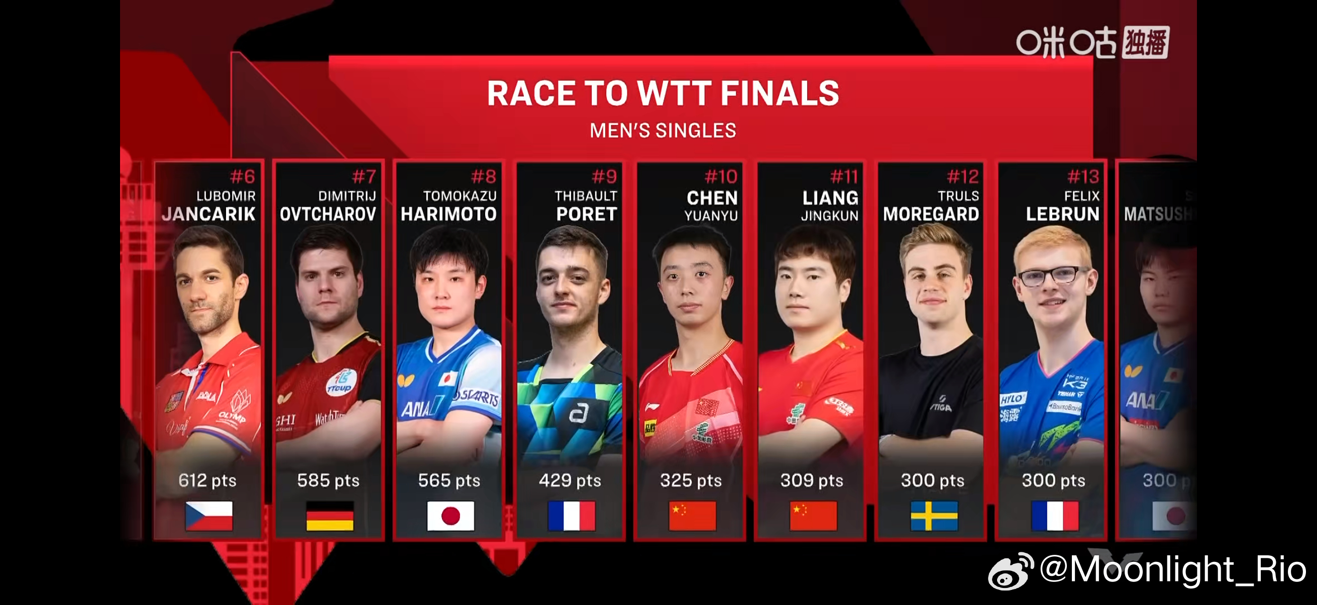 王楚钦成了WTT新加坡大满贯男单独苗了!由于陈垣宇3比4不敌莫雷加德无缘四强,