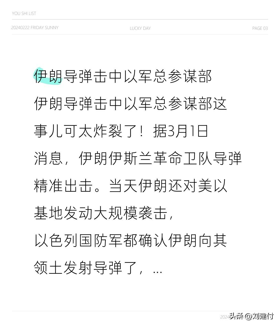 伊朗导弹击中以军总参谋部 伊朗导弹击中以军总参谋部这事儿可太炸裂了!据3月1日消息,伊朗伊斯兰革命卫队导弹精准出击。当天伊朗还对美以基地发动大规模袭击,以色列国防军都确认伊朗向其领土发射导弹了,防御系统也在拼命拦截。 以色列那边更是紧张,国土防卫司令部直接把预警信息发到相关地区手机上,中部还响起了警报声。这一事件无疑会让地区局势更加紧张,不知道后续美以会有啥反应,国际社会又会如何调解,真是让人捏把汗!