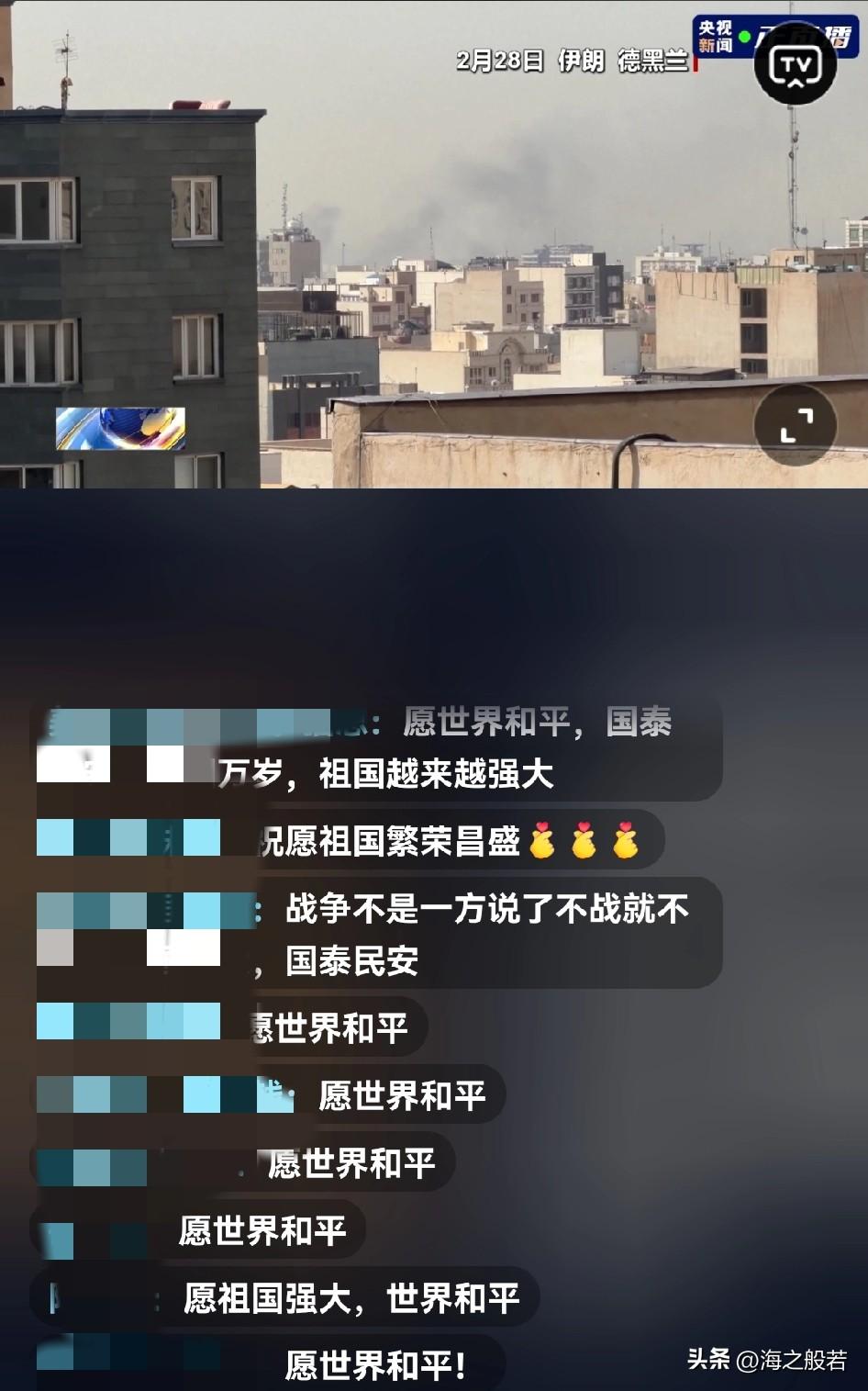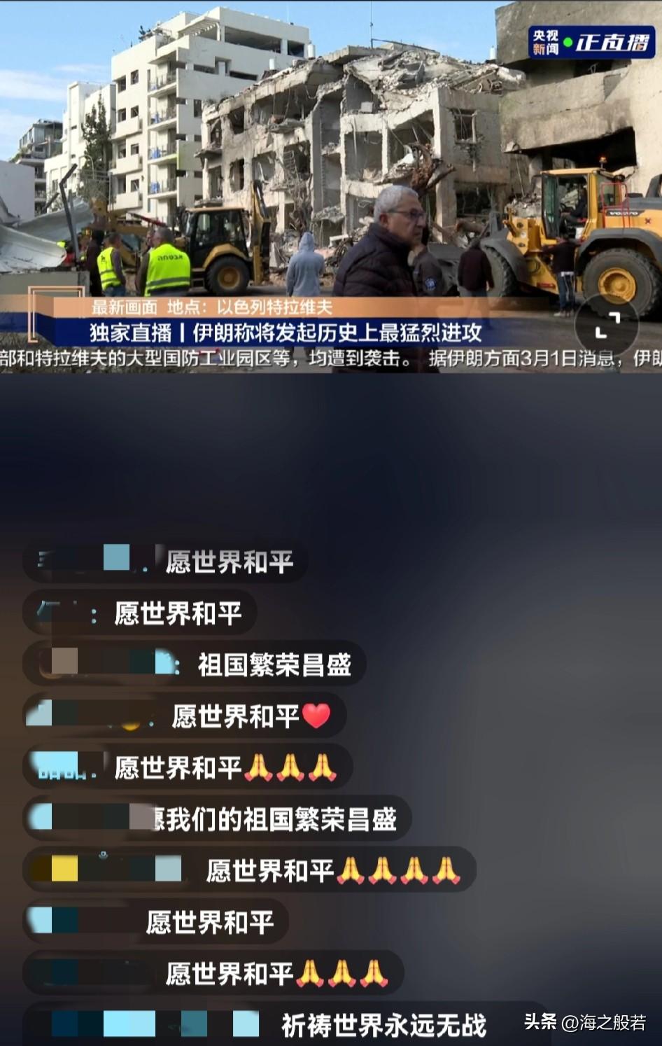 看直播,世界的另一端,以色列浓烟滚滚,炮火连天,被炸坏的高楼,惊恐中的人民,画面让人触目惊心,不寒而栗。 伊朗这边,最高领袖遇难,革命卫队开始准备大规模导弹无人机,准备发起报复,3月1日伊朗已袭击了27个美军。 战争就是互相伤害。反观我们处在一个和平安全的环境里,国泰民安。或许很多人和我有同样的感慨,看看满屏都飘着愿世界和平,祖国万岁!