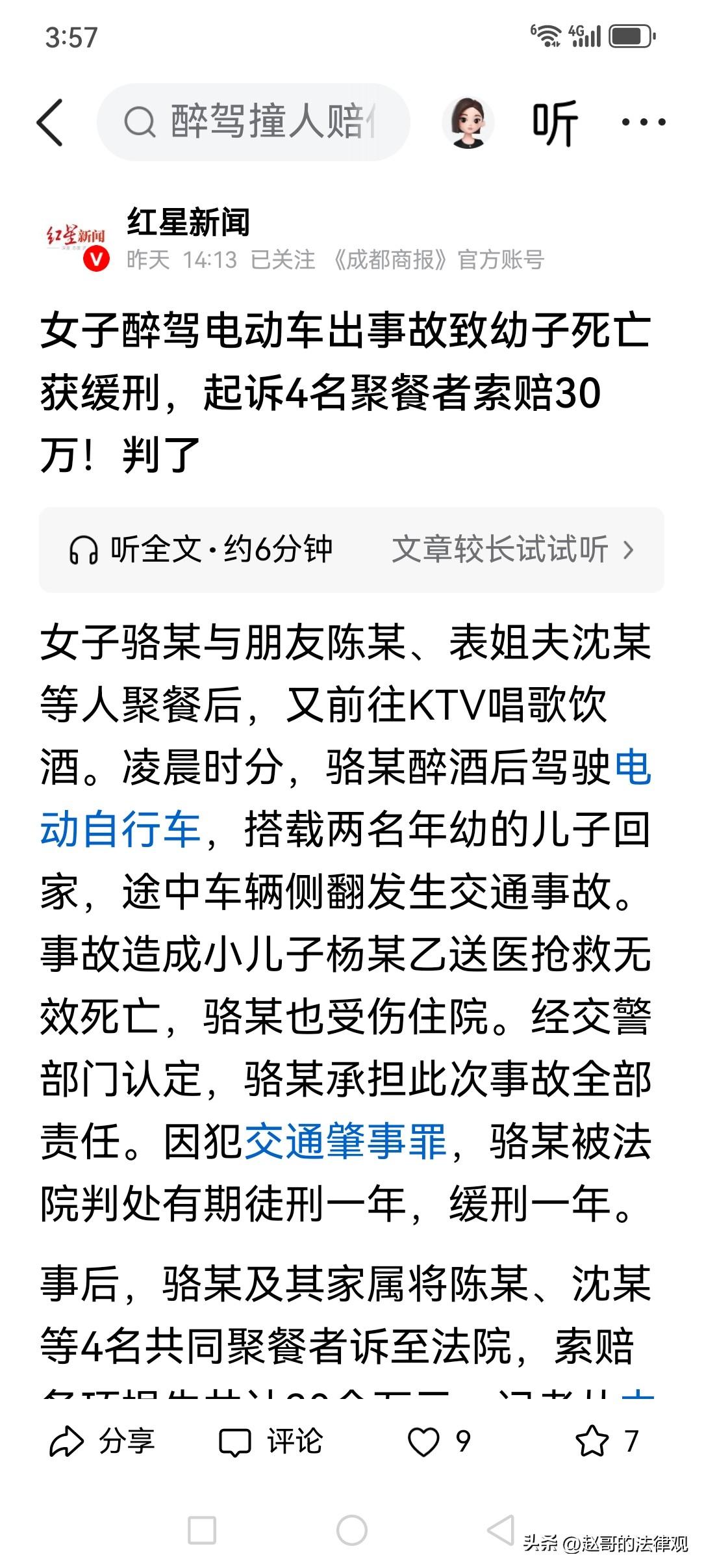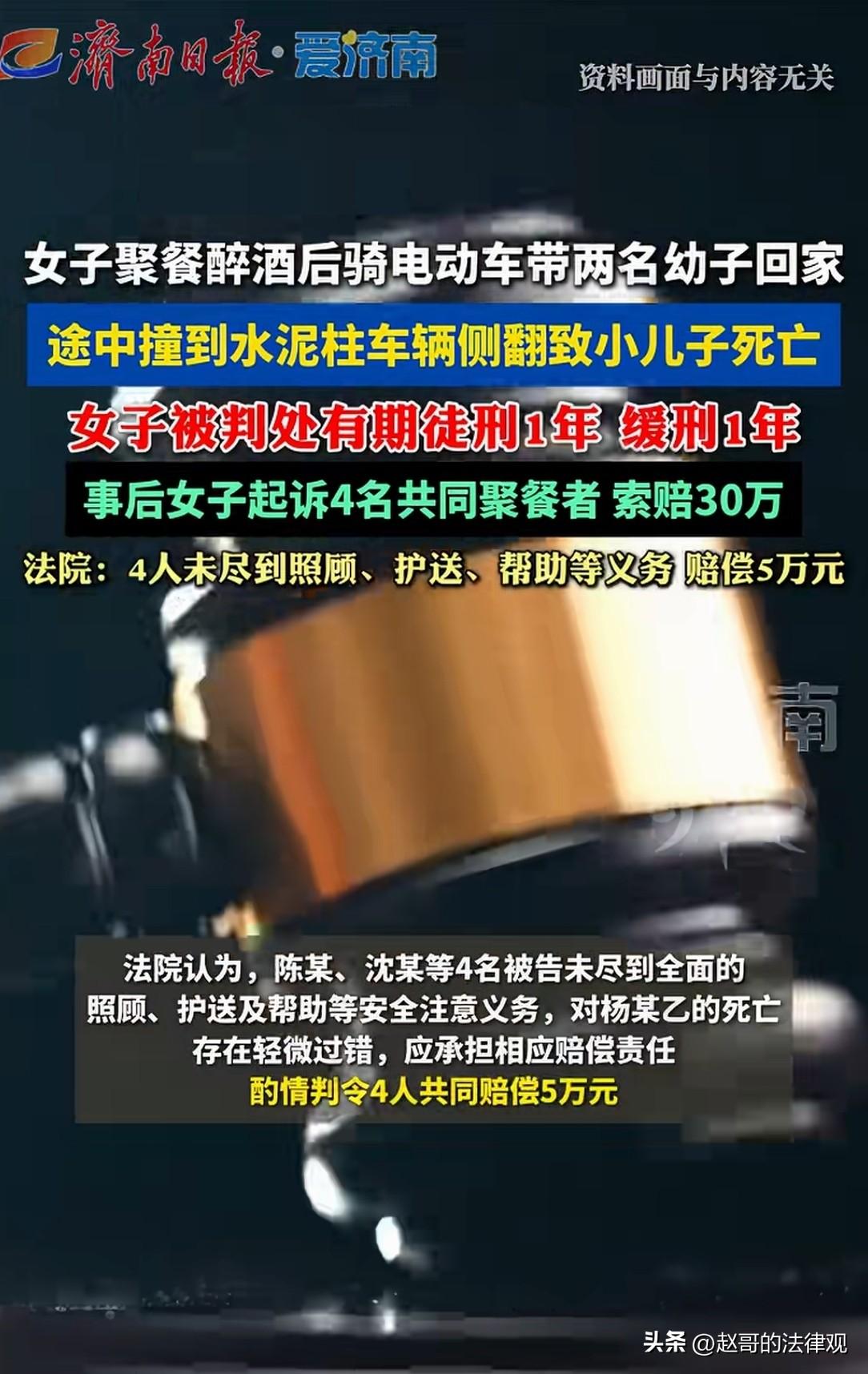 云南宜良,女子扔下两个孩子,和4个朋友一起吃饭喝酒,晚上11点多,几人意犹未尽,又去KTV唱歌、喝啤酒,一直玩到凌晨才散场。凌晨3点多,女子醉的东倒西晃,但她满不在乎,仍骑电动车带两个幼小的儿子回家,路上电动车撞到水泥支柱,小儿子经抢救无效死亡,女子因犯交通肇事罪,被判缓刑。事后,女子将4名共同聚饮酒的人诉至法院,索赔30多万,法院这样判。 2024年12月15日下午,骆某带两个年幼的儿子,找来朋友陈某家来串门。 陈某又约宋某,宋某约了武某,骆某也约了表姐夫沈某。 5人一块在陈某家吃饭,吃饭时骆某、宋某、武某、沈某都喝酒。 几人连吃带喝一直持续到晚上11点,但几人仍然觉得没嗨够。 就跑到县城的一个KTV去唱歌,期间几人意犹未尽,又点了很多啤酒。 直到凌晨3点,几个人实在玩不动了才散场。 骆某此时已经喝的大醉,都站不稳了,但他仍坚持骑电动车带两个儿子回家。 不料,洛某因意识不清,电动车撞上路旁的水泥柱子,电动车侧翻。 交警认定,骆某承担事故全责,两个孩子杨某丙、杨某乙没有责任。 事故发生后,骆某受轻伤。 小儿子杨某乙经抢救无效死亡。 骆某因为犯交通肇事罪,被法院判处有期徒刑一年,缓刑一年。 事后,骆某及其家属认为,宋某、武某、沈某、陈某四个人,没有尽到合理劝阻、照顾、护送等安全保障义务。 更没有采取有效措施,防止损害后果发生,4人应对骆某受伤,以及其小儿子的死亡存在一定过错。 应该承担相应的赔偿责任。 骆某将4人起诉到法院,请求判令4人,连带赔偿医疗费、丧葬费、死亡赔偿金等各项损失共计30余万元。 法院审理认为,首先,骆某作为完全民事行为能力人,应该知道,自己的身体情况和酒量。 对于过量饮酒可能造成的损害后果,应该有预见能力。 她在饮酒过程中,对于放纵自身饮酒,有着较高程度的过错,应该认定饮酒者自身存在过错。 骆某醉酒后驾驶电动车载着两个孩子,违反了交通安全法规,导致自己的小儿子死亡。 经交警认定,骆某承担事故的全部责任,所以骆某应该承担主要责任。 其次,骆某吃饭的时候喝了酒,到KTV后又继续喝酒,已经处于醉酒状态。 陈某、宋某虽然先行离开了,但他们没有充分尽到完全的劝阻义务。 沈某,作为骆某的亲戚,又是骆某邀请来的,在离开KTV后先行打车离开。 没有充分尽到照顾、护送、帮忙等义务。 而且骆某还带着两个孩子随行,同饮人,更应该尽到完全的照顾护送义务。 武某辩解称,离开KTV的时候,他看到骆某已经处于醉酒状态。 就劝说骆某不要骑车,但骆某不听劝,骑车离开的时候,他不放心,一直骑车跟在骆某后边。 虽然武某行使了劝阻义务,但在骆某醉酒后,且两个年幼的孩子还跟随的情况下,他的照顾、护送义务明显不当。 法院确认骆某的损失为,医疗费4800.6元。 小儿子的损失,包括死亡前的抢救医疗费2191.24元、死亡赔偿金906240元、丧葬费57446.5元。 精神抚慰金,酌情确认了10000元。 骆某作为杨某乙的监护人,带领两个年幼的孩子,醉酒后违法驾驶电动车,致杨某乙死亡。 她对杨某乙的死亡存在明显过错,应该承担主要的民事责任。 宋某、武某、沈某、陈某没有尽到全面的照顾、护送、帮助等注意义务。 对于杨某乙的死亡,都存在轻微过错,应该承担相应的赔偿责任。 最终,法院判决:宋某、陈某各赔偿10000元。 武某、沈某各赔偿15000元。 这起事故让人唏嘘不已。一个母亲的醉驾,夺走了自己年幼孩子的生命。 她本人也被判缓刑,但更让人想不到的是,她随后将共同饮酒的朋友告上法庭,索赔30多万。 最终的判决结果,4名聚餐者共同赔偿5万元。 这与她索赔的30万元相去甚远。 本案中,武某虽然劝阻了骆某不要骑车,还跟在后面。 但在醉酒和两个孩子随行的情况下,照顾护送义务明显不当。 尤其是骆某,带着两个年幼孩子,还敢喝到半夜三更,还喝醉,且酒后驾车,这种女人害死自己儿子,还讹人,必须被逐出家门, 那么,共同饮酒,到底要承担多大的责任? 《民法典》第1165条:行为人因过错侵害他人民事权益造成损害的,应当承担侵权责任。 本案中,骆某作为完全民事行为能力人,自身对过量饮酒的危害,及醉酒驾驶电动车的危险应有预见能力。 但其放纵自身饮酒,并醉酒驾车,导致小儿子死亡,其行为存在明显过错,应承担主要责任。 而陈某、宋某、沈某、武某四人,与骆某共同饮酒。 基于共同饮酒这一“先行行为”,他们对骆某负有一定的安全保障义务。 他们没有尽到劝阻义务,在骆某醉酒后,也未完全履行照顾、护送等义务,其不作为存在过错。 这种过错,与骆某小儿子死亡的损害后果之间,存在一定因果关系。 所以,4人需要承担相应的赔偿责任。 拿到了5万块钱,亲戚朋友都绝交了。 对此你怎么看?