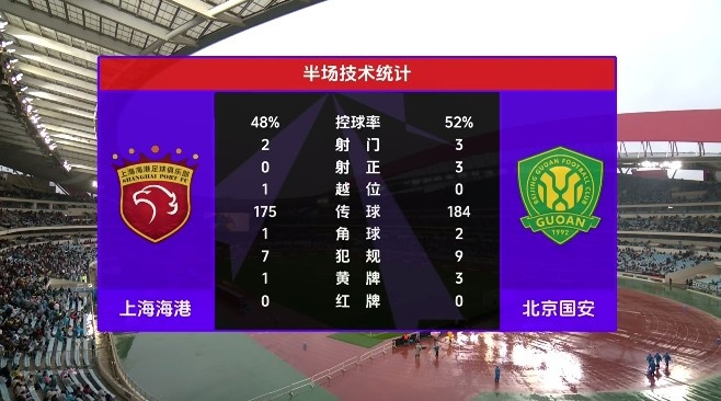 直播吧3月1日讯超级杯决赛,上海海港半场0-1落后北京国安。双方半场数据如下