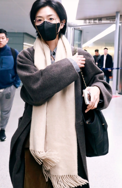 万茜里面穿时尚的格纹衬衣 外面套着咖啡色的V领毛衣两件衣服叠穿的效果很出彩 她下身穿棕色裤子,脚踩黑色的高帮靴,走路格外的有气势,还很有型 万茜外面穿了一件灰色的大衣,脖子上还系着白色的围巾,凸显出了一种文艺气息,还有种知性的浪漫感 她留着清新的短发,戴着一款眼镜,虽然很神秘,不过整个人彰显出了中性之美,确实是太有吸引力了