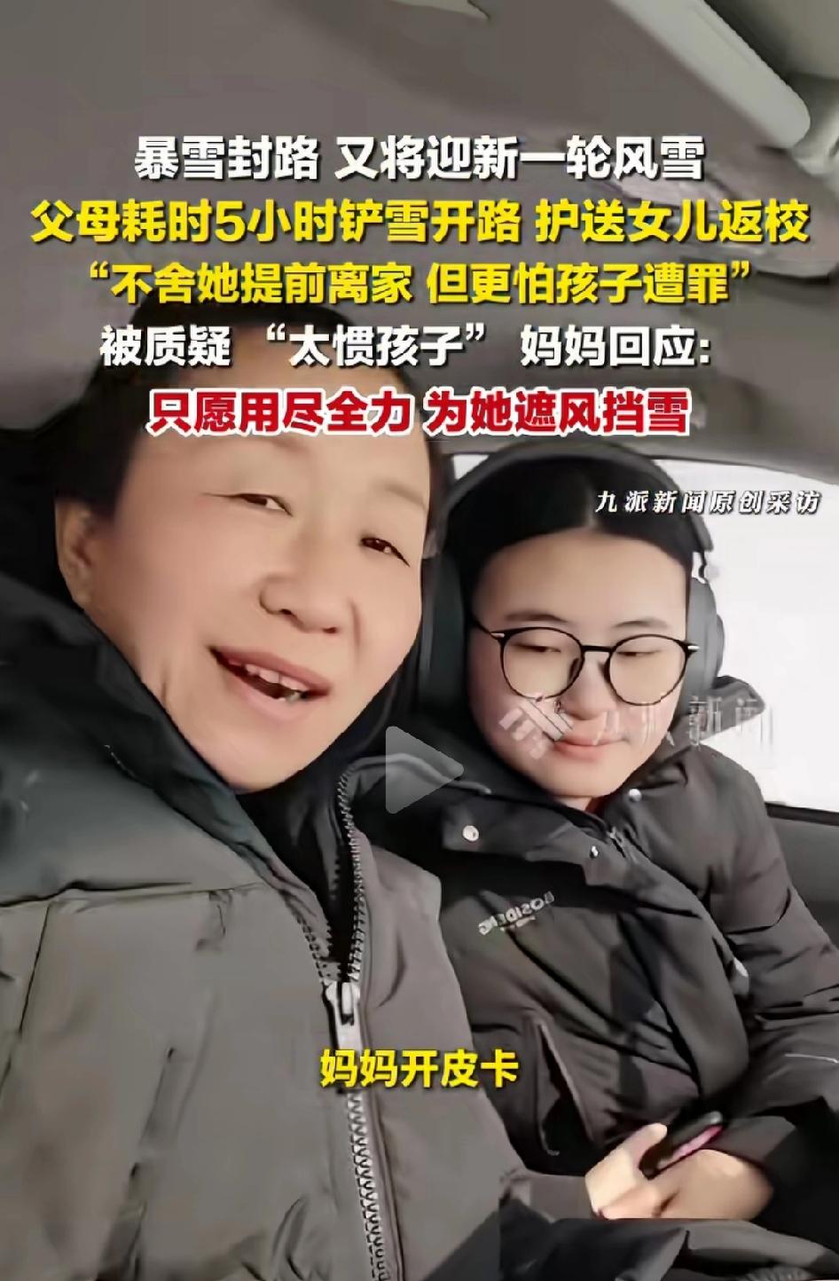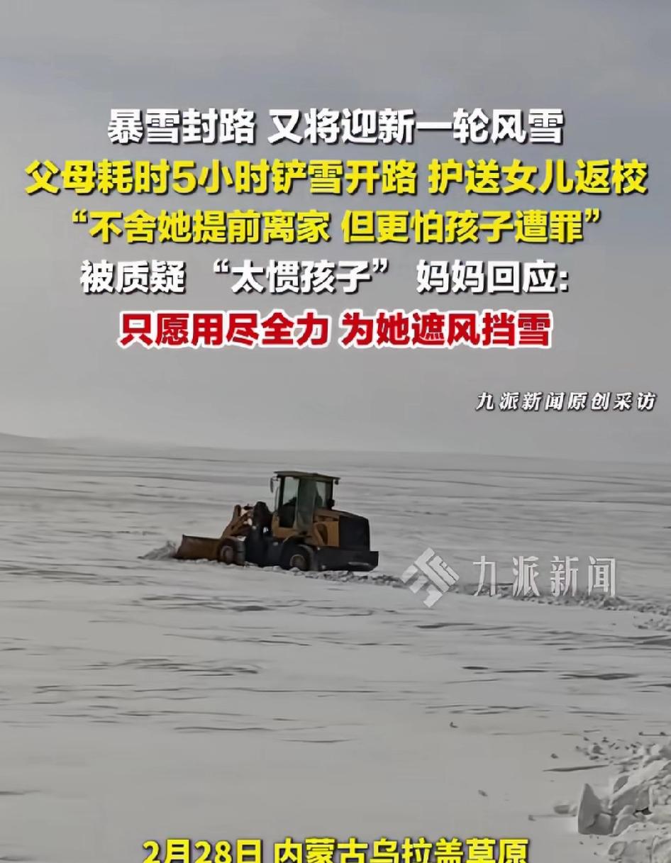 破防了!内蒙古暴雪封路,大二女儿要返校,再不走就会被新一轮大雪困在家中。没想到父亲开着铲车破冰清雪,母亲开皮卡载女儿紧跟在后,茫茫雪原里开出一条生路。5小时只走七八里地,父母送完再顶着风雪返程,全程只为让女儿平安上学。有人不解,可父母说的话引无数人点赞! 内蒙古锡林郭勒盟乌拉盖草原深处。 连续多场暴雪把天地冻成一片白茫茫,狂风卷着雪沫子打得人睁不开眼,原本平坦的路被厚厚的积雪封住,车开不进、人走不出,客运全线停运。 天地之间白茫茫一片,风刮在脸上像刀割,连呼吸都带着冰碴,出门几步,睫毛、眉毛瞬间结上白霜。 天气预报反复预警:3月3日还有暴风雪,再不走,女儿很可能彻底被困在家里,无法按时返校,强行上路更是随时有被困野外的危险。 女儿在包头读大二,开学日期一天天逼近,一刻也不能拖了。 一家人围在屋里,看着窗外呼啸的风雪,心里又急又沉。 女儿攥着书包带,既担心耽误学业、影响选课与考试,又舍不得让爸妈跟着冒险,话到嘴边又咽回去,眼圈悄悄发红,强忍着不让眼泪掉下来。 她心里一遍遍地想:要不就再等等吧,大不了请假,可真要耽误学业,又不甘心。 父母看在眼里,疼在心上,他们比谁都清楚草原暴雪的凶险,可他们更舍不得让女儿一个人担惊受怕、左右为难。 没有丝毫犹豫,一家人咬咬牙,做出了最艰难也最坚定的决定: 提前出发,铲雪开路! 早上8点,天刚亮透,寒风像刀子一样刮在脸上。 父亲裹紧厚重的棉衣,戴上棉手套,一头扎进风雪里,爬上自家铲车。 引擎轰鸣着冲破寂静,铁铲狠狠扎进积雪里,一点点往前推、一点点压出路面。 雪块、冰碴噼里啪啦砸在铲车玻璃上,视线被白茫茫的风雪糊住,他就每隔一段时间就擦一次玻璃,眼睛死死盯着前方,仔细的辨别着方向,不敢有半点分心。 每推一米都要费很大力气,车胎不停打滑,他就一点点调整方向、稳住油门,冻得僵硬的手指紧紧攥着操作杆,心里只有一个念头:再往前一点,再稳一点,别让媳妇和闺女出事。 母亲白女士稳稳开着皮卡,载着女儿,紧紧跟在铲车刚开出的窄路上,不敢快、不敢偏。车轮碾在雪道上咯吱作响,眼睛一刻不离前面铲车的影子,心里担心着自己的丈夫。 女儿坐在后座,看着父亲的铲车在前面一点点开路,眼睛控制不住的就红了起来 她想开口让爸妈回去,可话到嘴边,又被这沉甸甸的爱堵得说不出一个字,只能默默看着窗外,把这一幕死死刻在心里。 就这样,从清晨8点走到下午1点,整整5个小时,一家人在冰天雪地里艰难行进了七八里地,平均一小时只走一两里。 每一米路,都是父亲用铲车一点点推出来的;每一步平安,都是父母用风险换来的。 冻僵的手、发麻的腿、灌进领口的雪、呼出来的白气,全都凝成了最实在、最沉默的疼爱。 终于,他们接上了主路,那一刻,父亲长长松了一口气,母亲紧绷的肩膀才缓缓放下,一家三口悬了一上午的心,才算轻轻落地。 之后再转送到镇上姥姥家,由舅舅接力送往机场,一环接一环,不敢有半点疏漏,只为确保女儿万无一失。 把女儿送上车的那一刻,父母站在风雪里,一直望着车的方向,直到看不见车尾灯才肯转身。 他们再独自返程,又在暴风雪里耗了三四个小时,冻得浑身僵硬、手脚发麻,才疲惫不堪的回到家中。 有人不理解,甚至在网上质疑:“至于吗?太惯孩子了吧?” 母亲白女士看到后,平静却无比有力地回应: “我们舍不得女儿提前走,但更怕暴雪让她遭罪。身为父母,只要能护她平安,我们愿意拼尽全力,为她挡掉所有风雪。” 消息来源:九派新闻 及网络公开内容,本文配图/视频素材来自九派新闻 ,以上仅用于内容分享,侵权即删,谢谢!