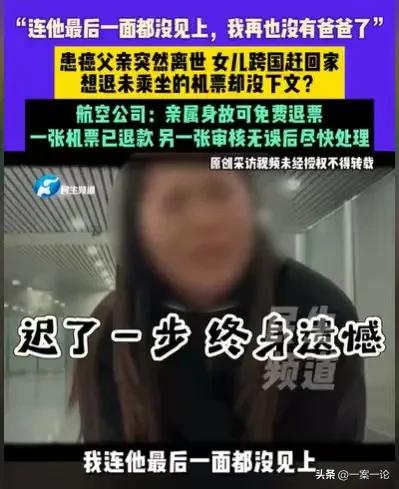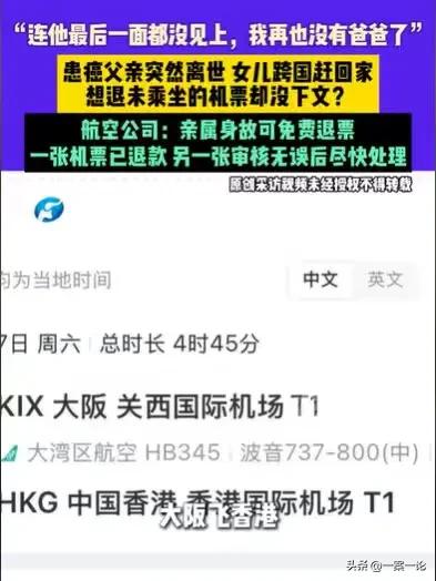 福建福州,女子的父亲患了癌,情况严重,她就订了机票,打算过几天回家,结果她的父亲突然离世,她只好提前回家,忙完父亲的事情,她就要退之前定的机票,因为航空公司有规定,他们有亡退政策,亲属身故可以免费退票,可她提供了相关的材料,却没有下文,无奈之下,她只好寻求帮忙。 2月4日,正在上班的林女士接到家里打来的电话,家人告诉她,她的父亲情况非常不好,希望她能够回来看父亲最后一面。 在日本大阪工作的林女士,接到这个电话,心急如焚,就想着赶紧回去看看父亲。 她的父亲是在三年前患了癌,父亲撑了三年,可能真的是撑不下去了。 父亲得了重病,林女士不能陪在父亲身边,依然要在异国工作,如今父亲情况严重,她决定回去看父亲最后一眼。 这些年来,林女士一直在异国定居工作,就连父亲在三年前患了癌,她都没有时间回来陪父亲,她对父亲充满了愧疚。 就这样,为了看父亲最后一眼,她订了2月7号的机票,从大阪飞往香港,再订2月8号的机票,从香港飞往福州。 她把一切都安排妥当了,过几天,她就可以回去看父亲了。 可没想到,还没有到2月7号,正在上班的她,就得到消息,她的父亲突然离世了。 林女士得到父亲离世的噩耗,非常心痛,想到自己,还没有见到父亲最后一面,父亲就没了,她也就没有家了,她非常悲伤。 下了班之后,她就赶紧定了最快的一个航班机票,她一下班就去坐飞机赶回家。 等她回到家,她又匆匆忙忙地处理父亲的后事,等她一切处理完好之后,她已经身心疲惫。 但她不得不继续返回日本,回到自己工作的地方,继续自己的生活。 她要做的事情就是退票,2月7号和2月8号的票,虽然她已经联系了工作人员申请取消,但是她需要提供资料,要提供父亲的死亡证明以及亲子关系证明。 林女士很清楚,航空公司是有亡退政策,如果是亲属身故,可以免费退票的。 她把该提供的资料,都提供给了工作人员,就想着让他们赶紧把票都退了,毕竟从国外飞往国内,这些机票,价钱可不便宜,这也是一笔不小的支出。 可是她提供了所有的资料,却一直没有下文,她2月7号和2月8号订的机票始终没有退。 这件事压在她心里,让她非常难受,本来父亲离世了,她就已经没有家了,她本来就难以接受这个事实,如今又遇到这样的事,她真的太难受了。 但这几张机票,不管她怎么努力,都无法让工作人员给她退票,最后她只好找来调解员。 面对调解员的联系,航空公司的工作人员表示,林女士提供的资料,他们会进行第1遍的审核,之后他们还要交给票台第2次审核,现在已经有投诉专员在处理这件事了。 有了调解员的帮忙,林女士的事情终于有了着落,她有一张机票已经退钱了,有一张也在审核,如果没有问题也会退钱。 林女士遇到这样的事情,如果航空公司确实有规定,亲属身故可以免费退票,那么他们就应当给林女士免费退钱。 《公共航空运输旅客服务管理规定》仅原则性要求,旅客非自愿退票,不得收取退票费,但将具体操作细则(如证明资料、亲属范围)授权给了各家航司自行制定。 毕竟林女士退票并非是自愿退票,而是逼不得已的情况下,才退票的,在这种情况下,航空公司应当给林女士退票。 那么你对林女士遇到的事情有何看法呢?