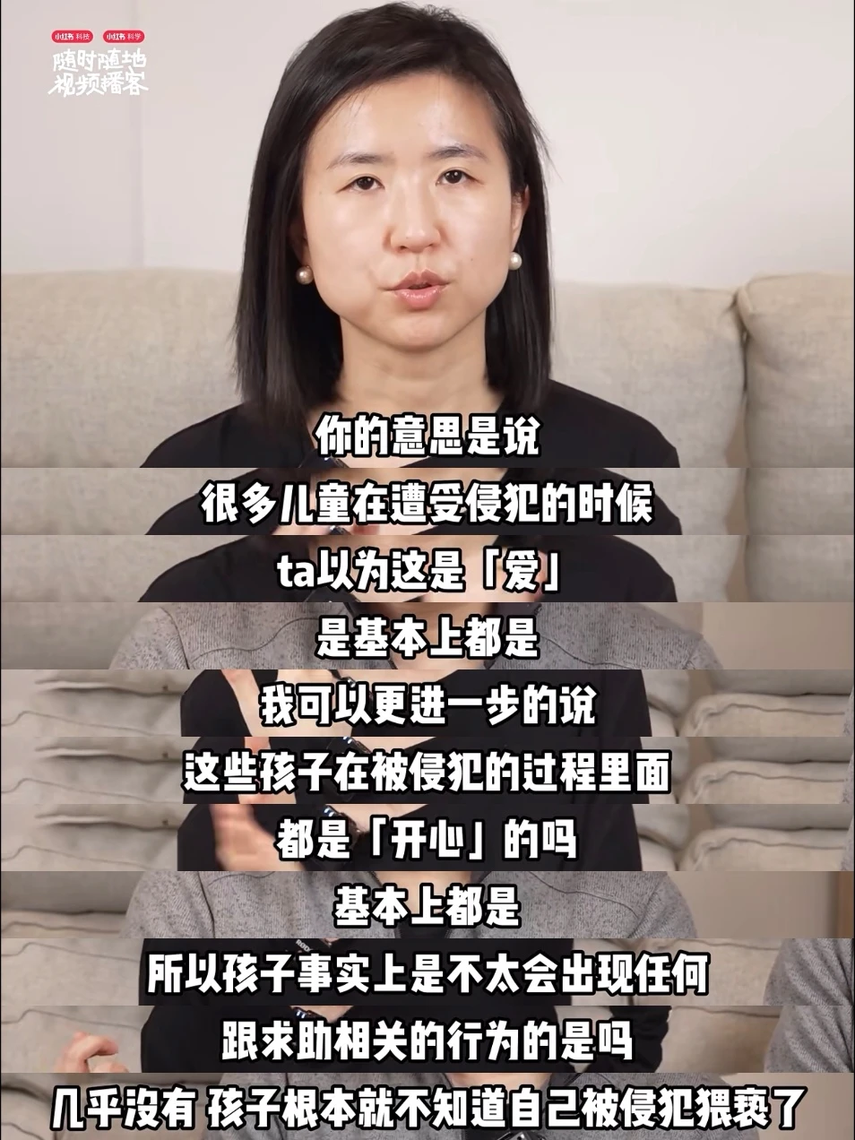 🍁很多孩子被侵犯时根本不知道那是伤害,甚至以为那是“爱’,是‘游戏’。访谈中说一个孩子从3岁到12岁,在多名至亲的轮流侵犯下长大,她以为这就是家人爱她的方式,直到十几岁才问出那句话: 这是坏的行为吗?