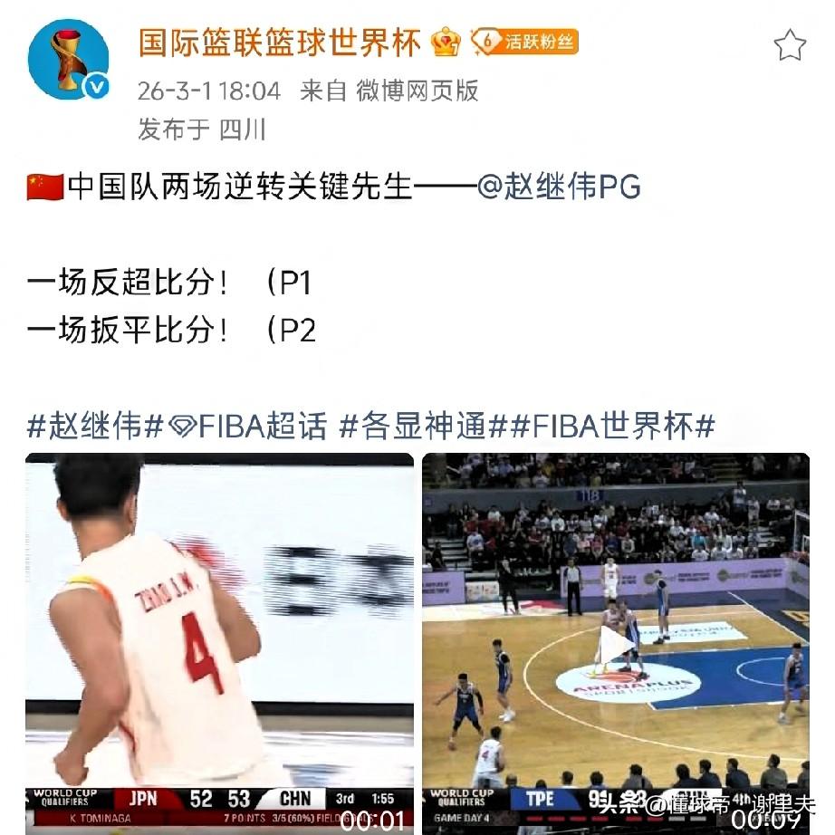 郭士强真是个传奇教练,世预赛连续两场逆转比赛,逆转日本和省队,敢主动降身高,末节用锋线压制对手赢球,中国男篮在世预赛中迎来两连胜,恕我直言,第三阶段在沈阳主场的两场比赛,打日本,要加强阵容厚度,周琦、李凯尔、王俊杰和杨瀚森征召回来,在击败省队后,FIBA发文称赵继伟是中国队两场逆转关键先生;也是全体