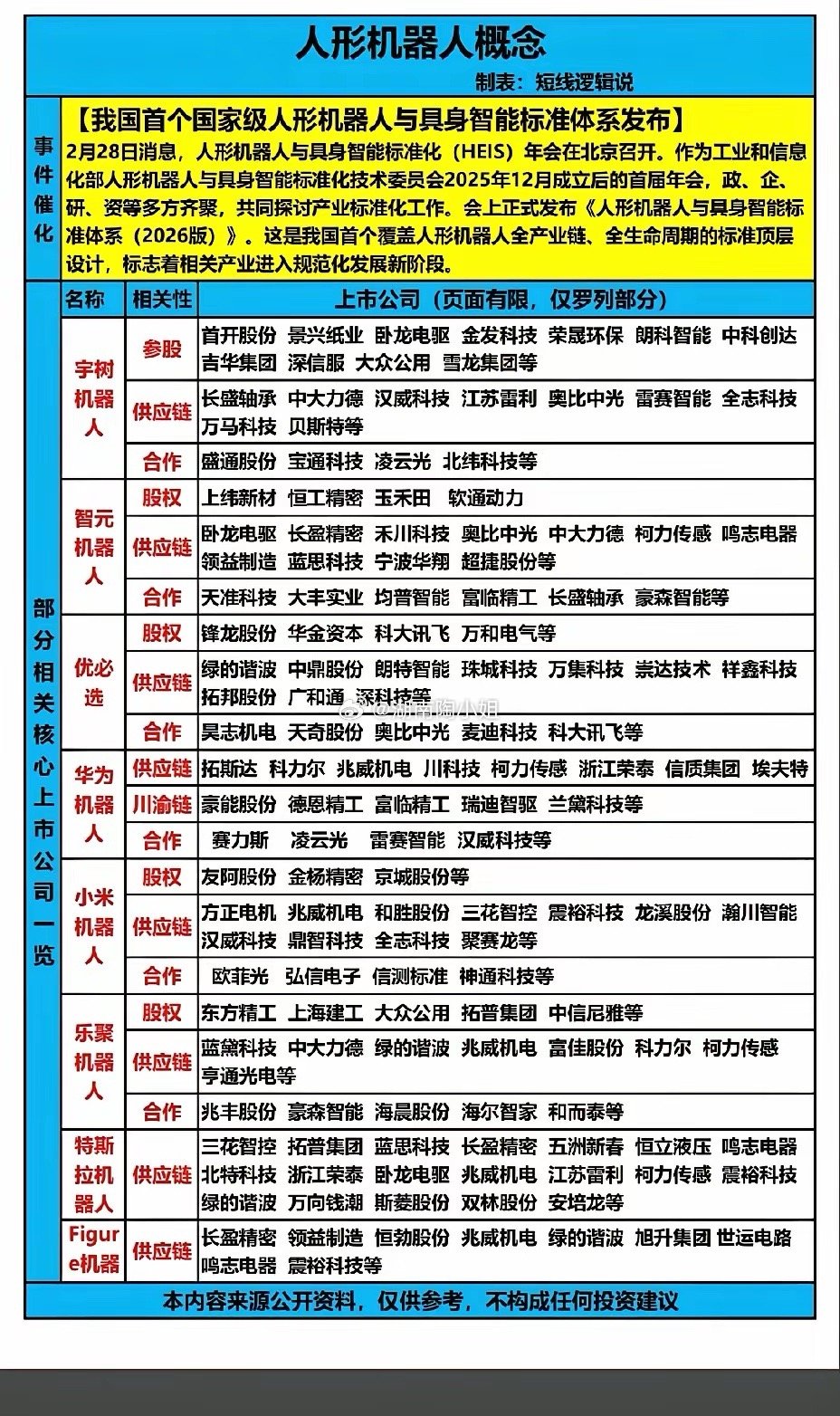 3月1日,星期天,下周A股这个板块值得重点关注!!!人形机器人首个国家级具身智能标准体系发布,标志着相关产业进入规范化发展新阶段,宇树机器人、智元机器人、优必选、华为机器人、小米机器人、特斯拉机器人相关概念股值得高看一眼!!!股市分析