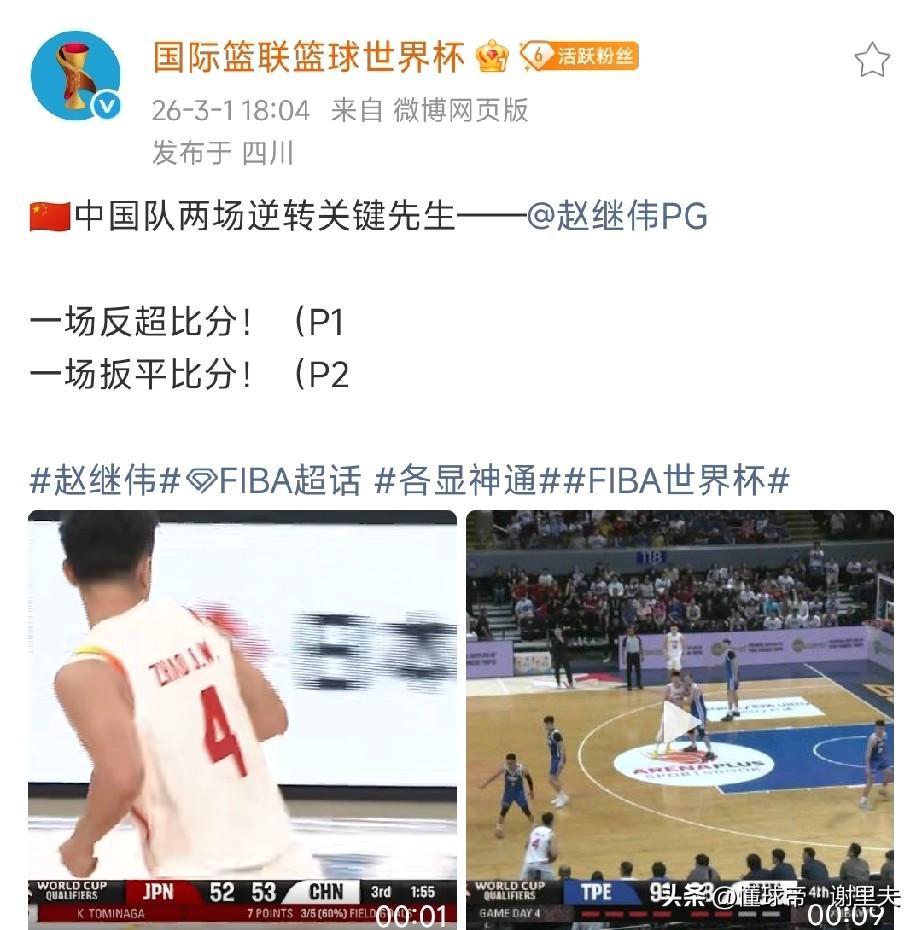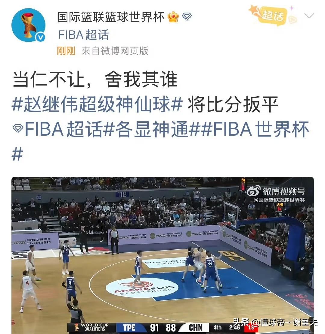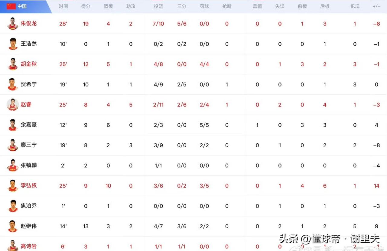 中国男篮太豪横了吧!第四节,只允许省队拿16分,净胜对手13分,郭士强12人轮转,其中朱俊龙、赵继伟、胡金秋和贺希宁得分上双,必须看到临危受命的李弘权和赵继伟是拿到全队±值最高两位球员。比赛中和赛后,国际篮联连续两次发文盛赞队长赵继伟的表现,一次称他是中国队两场逆转比赛的关键先生,一次回顾和称赞他绝平三分