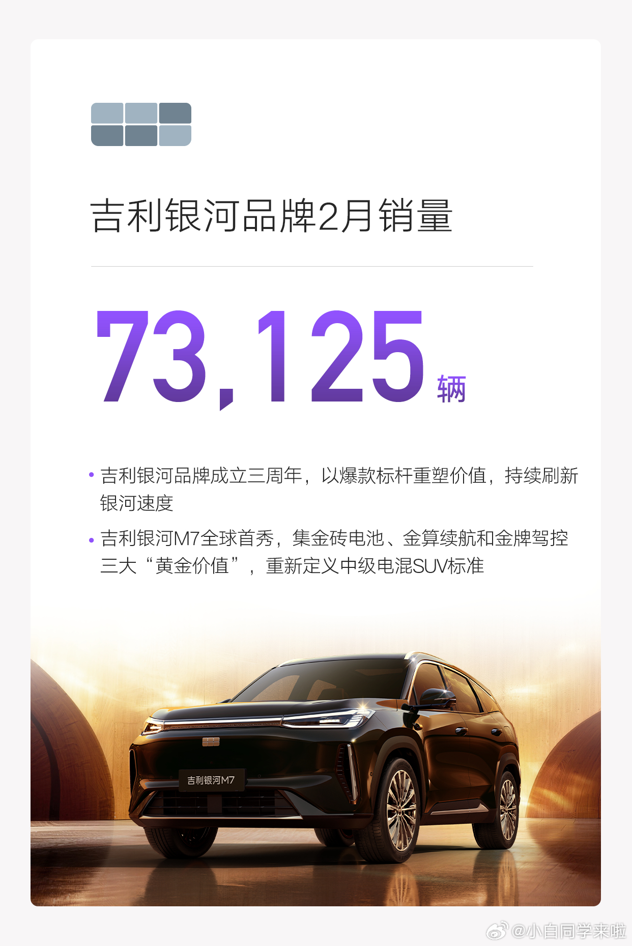 细分到各个品牌上,银河品牌 73125 辆、领克 27359 辆中新能源有 20496 辆、极氪 23867 辆。