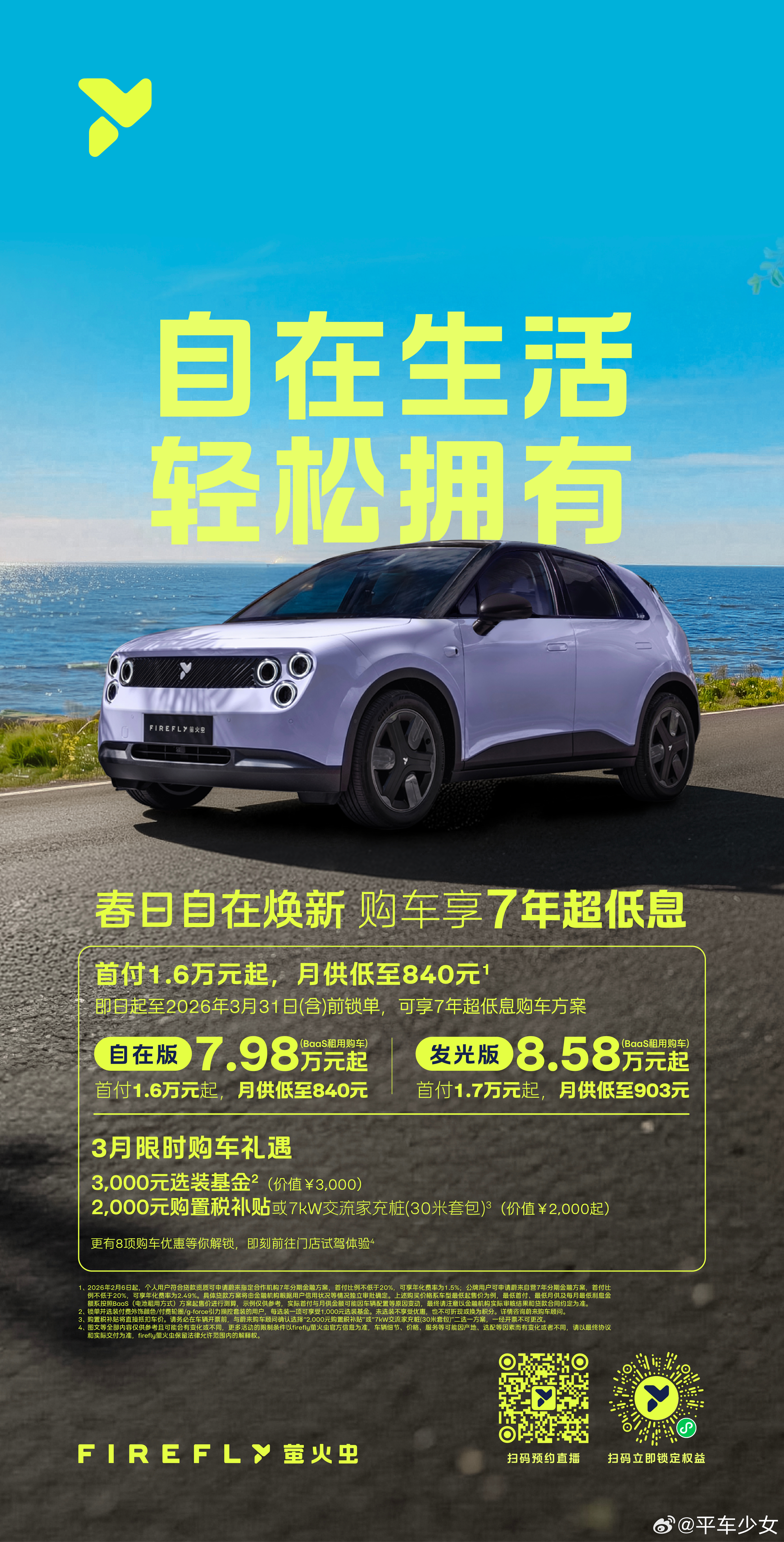 Firefly 萤火虫这小车是真顶啊!上市快一年,口碑销量双在线,刚好3月限时政策来了:7年超低息,首付1.6万起,还有选装基金、购置税补贴、家充桩…