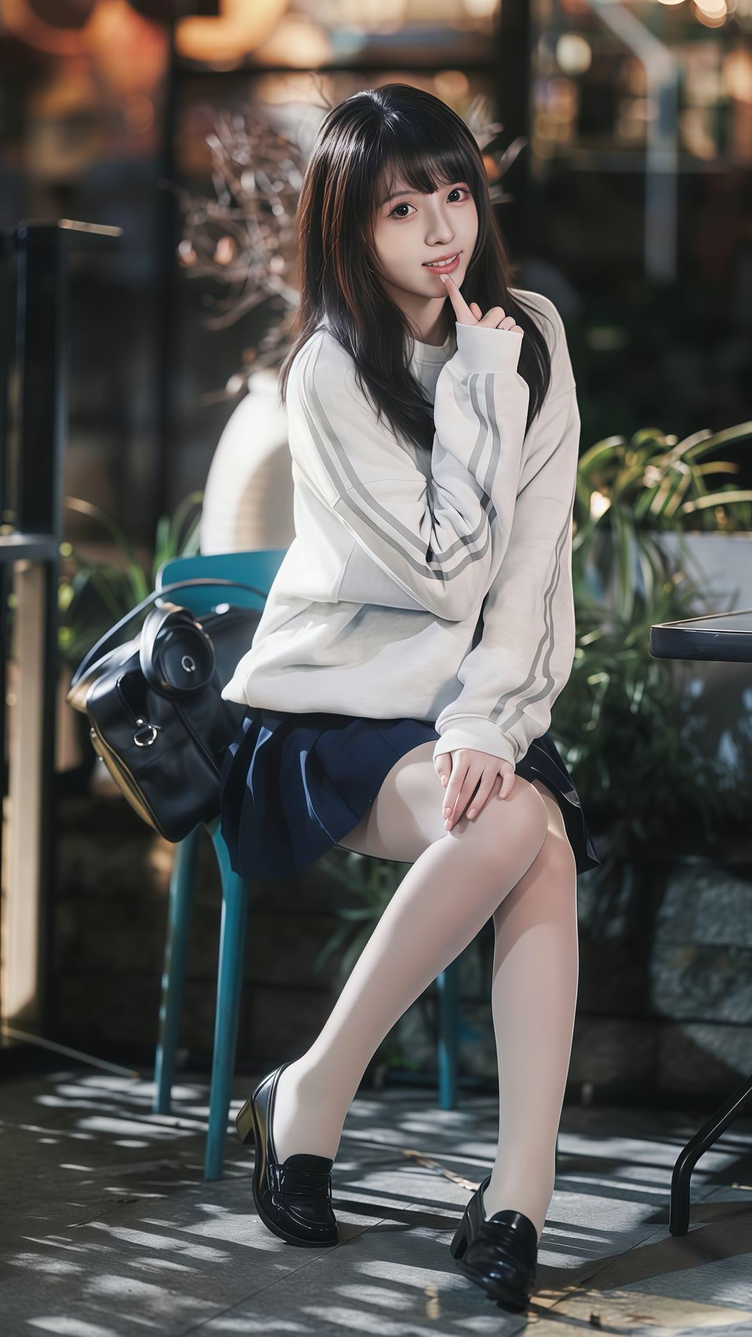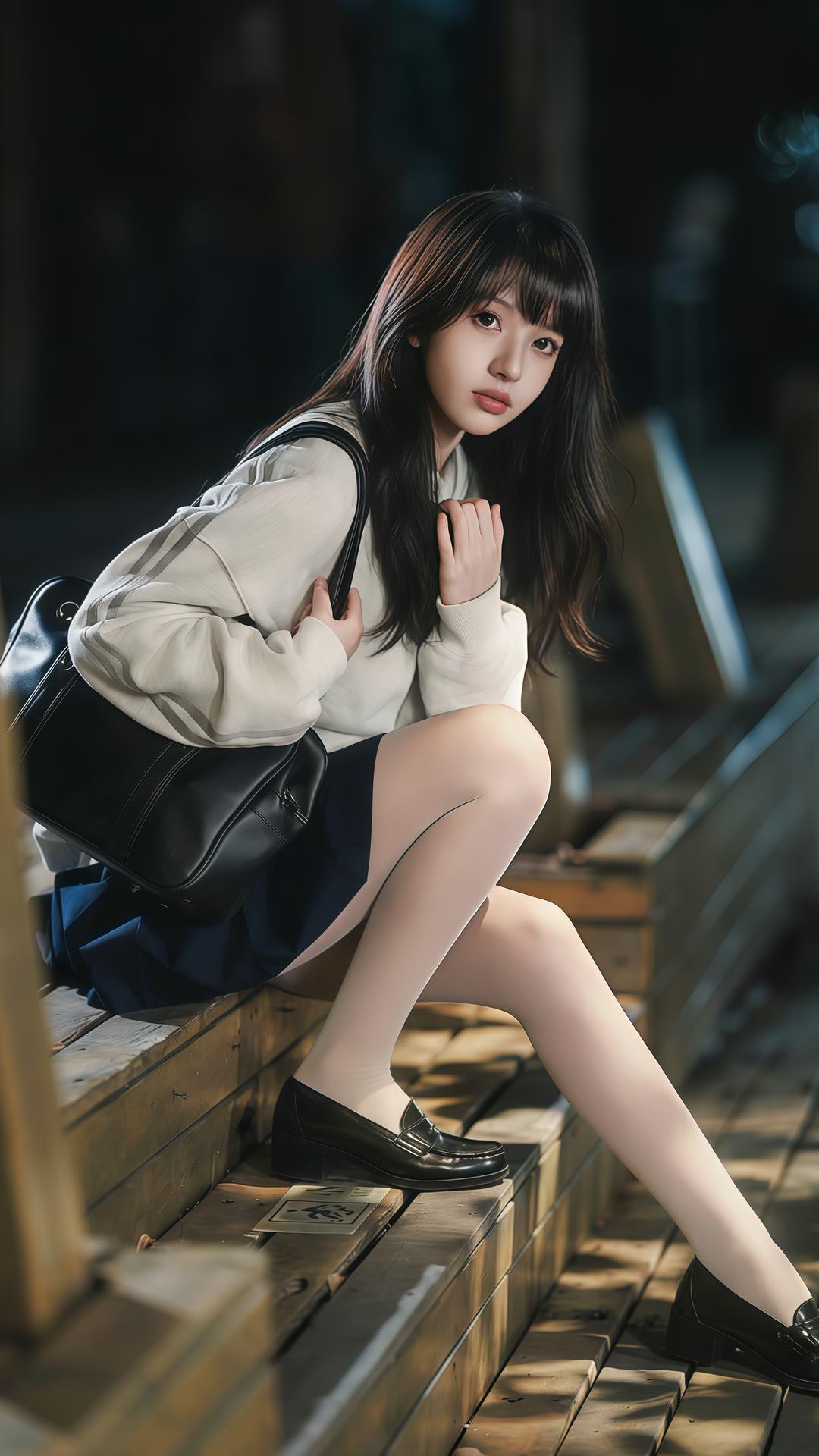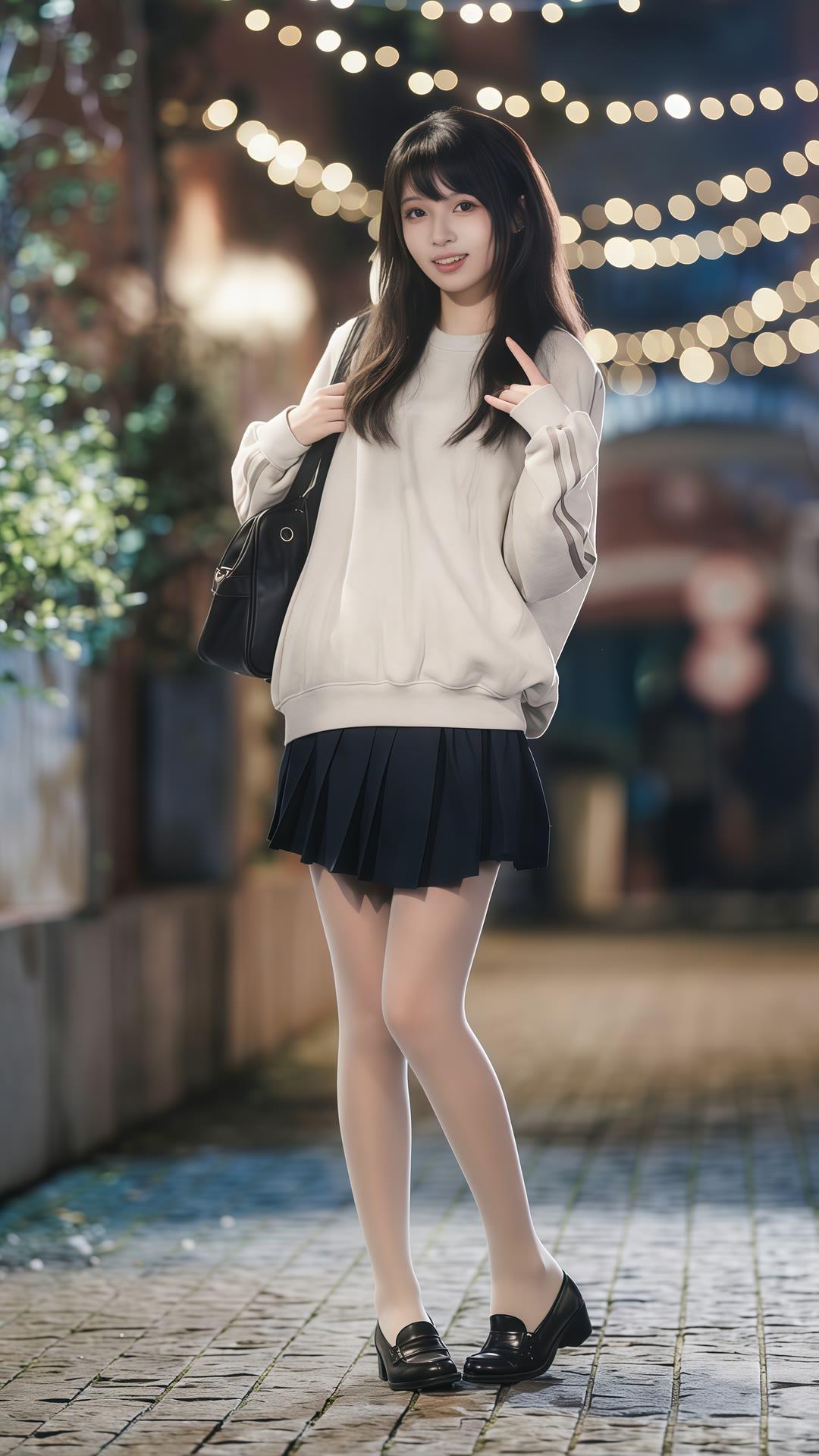 都市少女风,优雅黑裙搭配米色毛衣,手提包与高跟鞋完美搭配,夜晚街头的时尚穿搭。