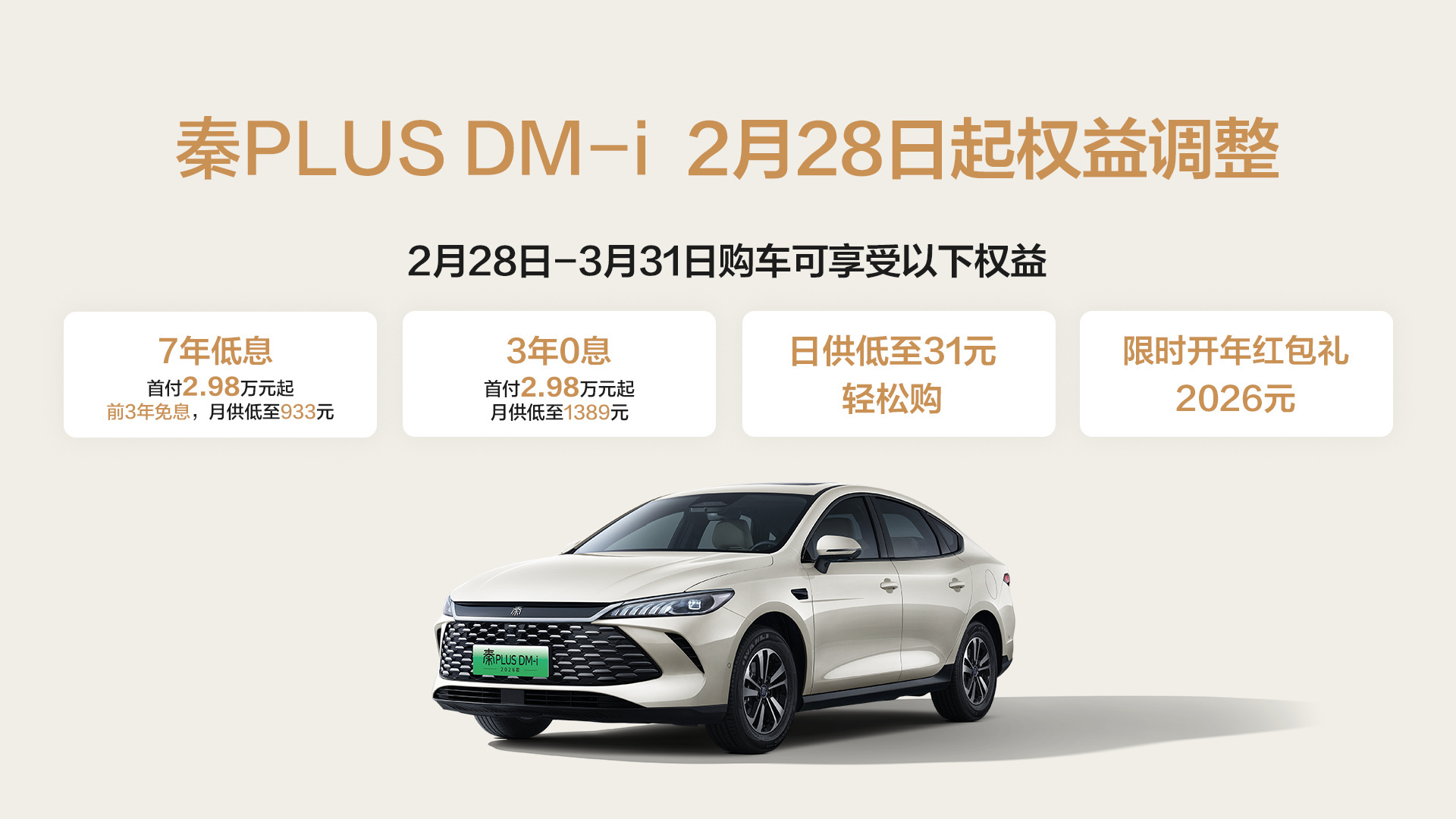 快讯,迪子开年加码优惠!秦PLUS官宣7年低息夯爆了2月28日,比亚迪秦PLUS推出其史上最强金融政策,活动从即日起持续至3月31日,为期一个月。购车可享受7年低息、3年0息等权益,算下来首付2.98万元起,日供低至31元就可轻松入手冠军家轿,日常通勤代步、家庭用车都能轻松覆盖。同时,秦PLUS DM-i、秦PLUS EV限时再享2026元开年红包礼,实实在在降低购车成本。大v聊车