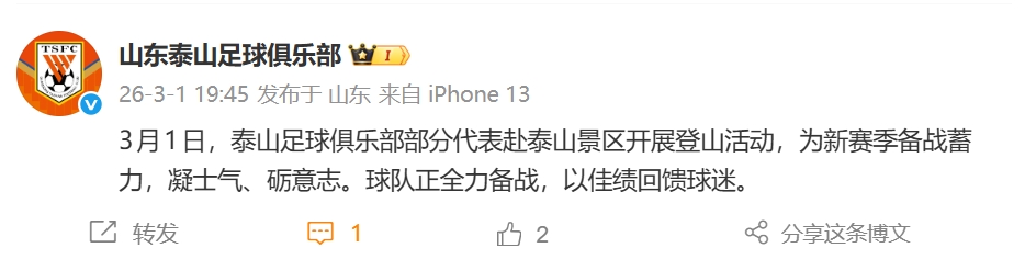 山东泰山官方微博写道:“3月1日,泰山足球俱乐部部分代表赴泰山景区开展登山活动,为新赛季备战蓄力,凝士气、砺意志。球队正全力备战,以佳绩回馈球迷。”