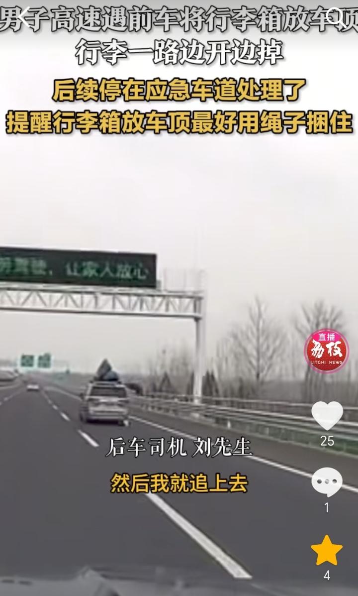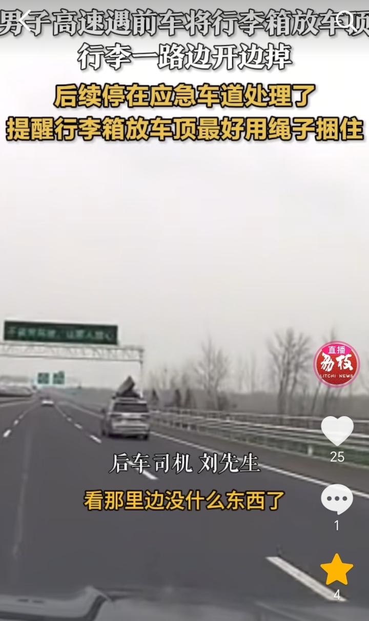 江苏徐州,前车在高速上行驶,车顶上不断有物品掉落,这一幕被后方车主刘先生发现,原来是车顶上放的行李箱开了,一路走一路掉。 刘先生称,刚从匝道上的时候,箱子就已经开了,刚掉东西的时候,我开始用远光灯一直闪提醒她,但是没啥反应,我也不敢往上追,看那里面没什么东西了,我就追上去给她打左右双闪,后来她从后视镜看到就停在了应急车道。 行李箱东西算是白装了,一路走一路掉都掉完了,如果有贵重物品那就损失大了,不过这也怨不得别人,只能怪她自己行李箱没栓牢靠,庆幸的是没有砸中后方车辆造成事故。 后方车主刘先生也是操碎了心,一直想法提醒前方车主,可见刘先生也是一个心底善良的人。
