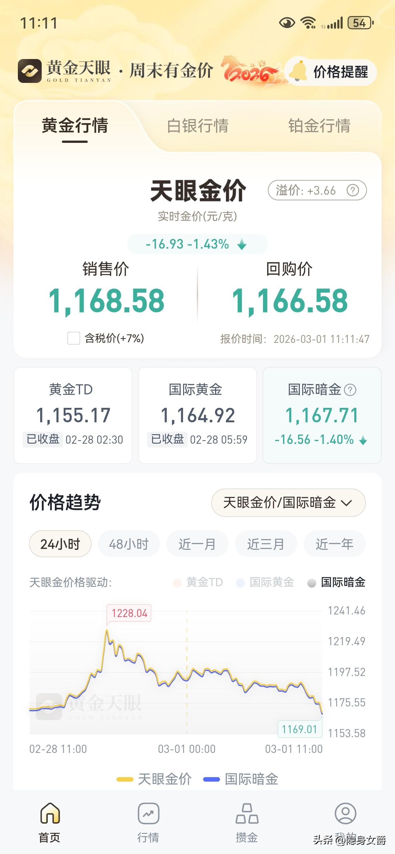 黄金价格周一有望冲上1200大关, 你们看!金价又开始涨了[捂脸]。 上午黄金价格跌破1700元,还以为周一开盘赶不上这波疯涨了,结果又冲上1190元了。 这波金价疯涨是因为周末的美伊局势,可能哈梅内伊死了,大家都以为战事结束了,金价也随之下跌。 现在虽然哈梅内伊死了,但是伊朗并没有乱掉,接班人继承哈梅内伊的遗志,继续反抗报复美以,然后金价又上去了。 现在的金价受国际局势左右,真是瞬息万变,周一追涨的朋友谨慎点。 老妇我反正只要金价在1800元以上,我就扔2/3,留一点体验金玩。