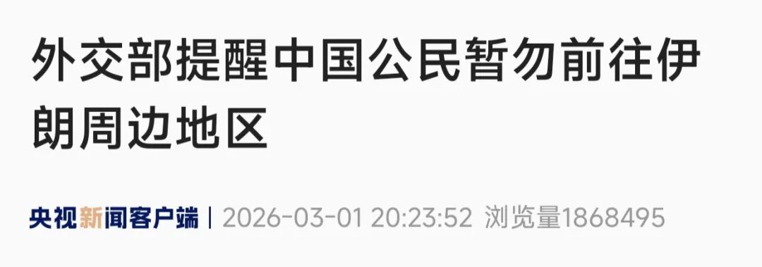 外交部提醒中国公民密切关注形势变化,暂勿前往伊朗周边受到军事冲击的国家和地区。已在上述国家和地区的中国公民进一步加强自身安全防范,避免前往军事设施、游行集会等敏感区域。如遇紧急情况,请及时报警并联系中国驻当地使领馆寻求协助。