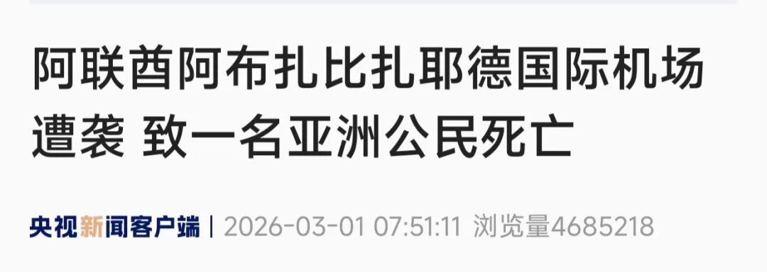 在阿联酋的首都阿布扎比,阿布扎比扎耶德国际机场当地时间3月1日遭遇袭击,致一名亚洲公民死亡,七人受伤。
