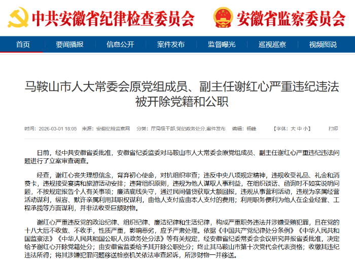 日前,经中共安徽省委批准,安徽省纪委监委对马鞍山市人大常委会原党组成员、副主任谢红心严重违纪违法问题进行了立案审查调查。