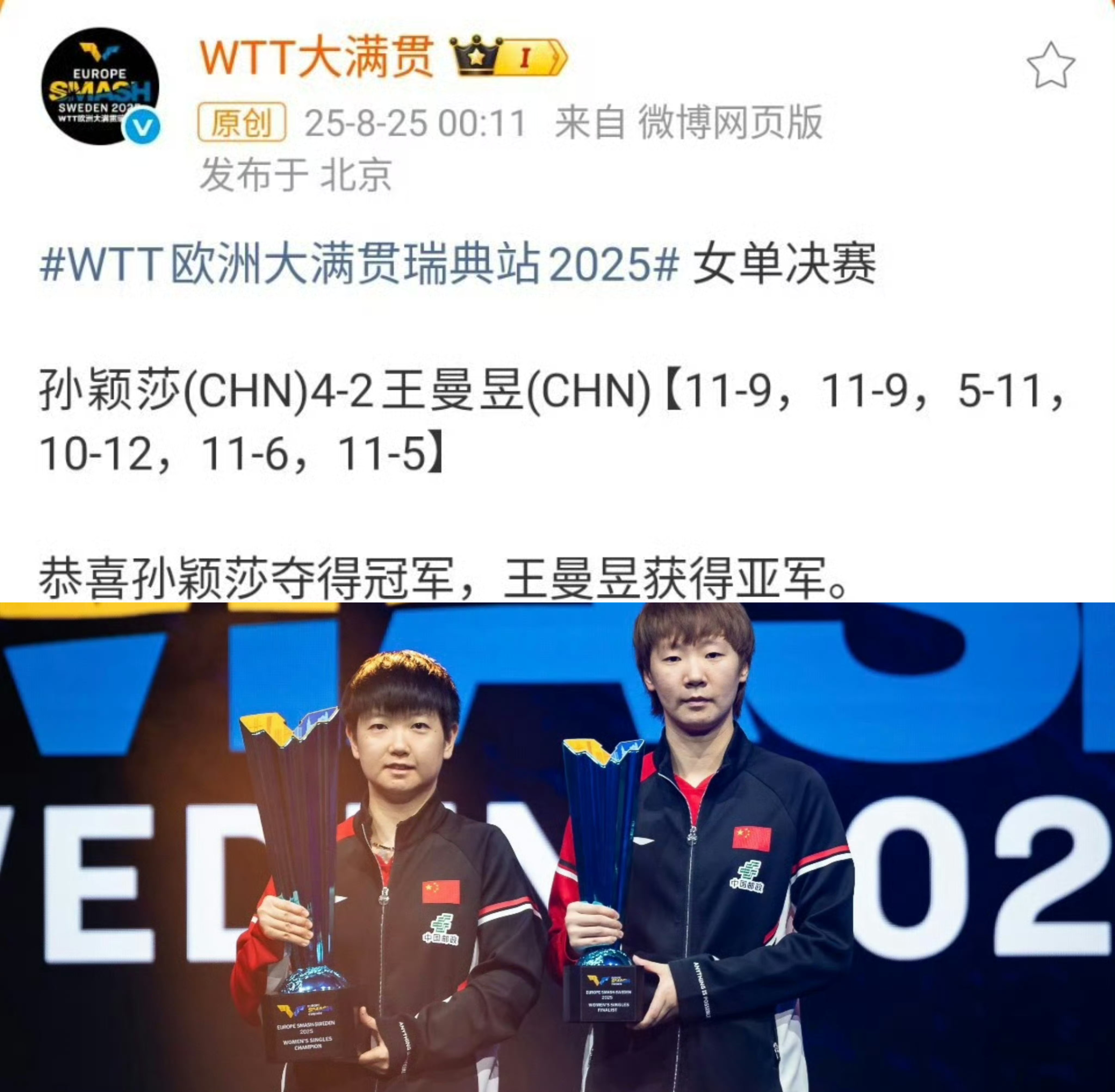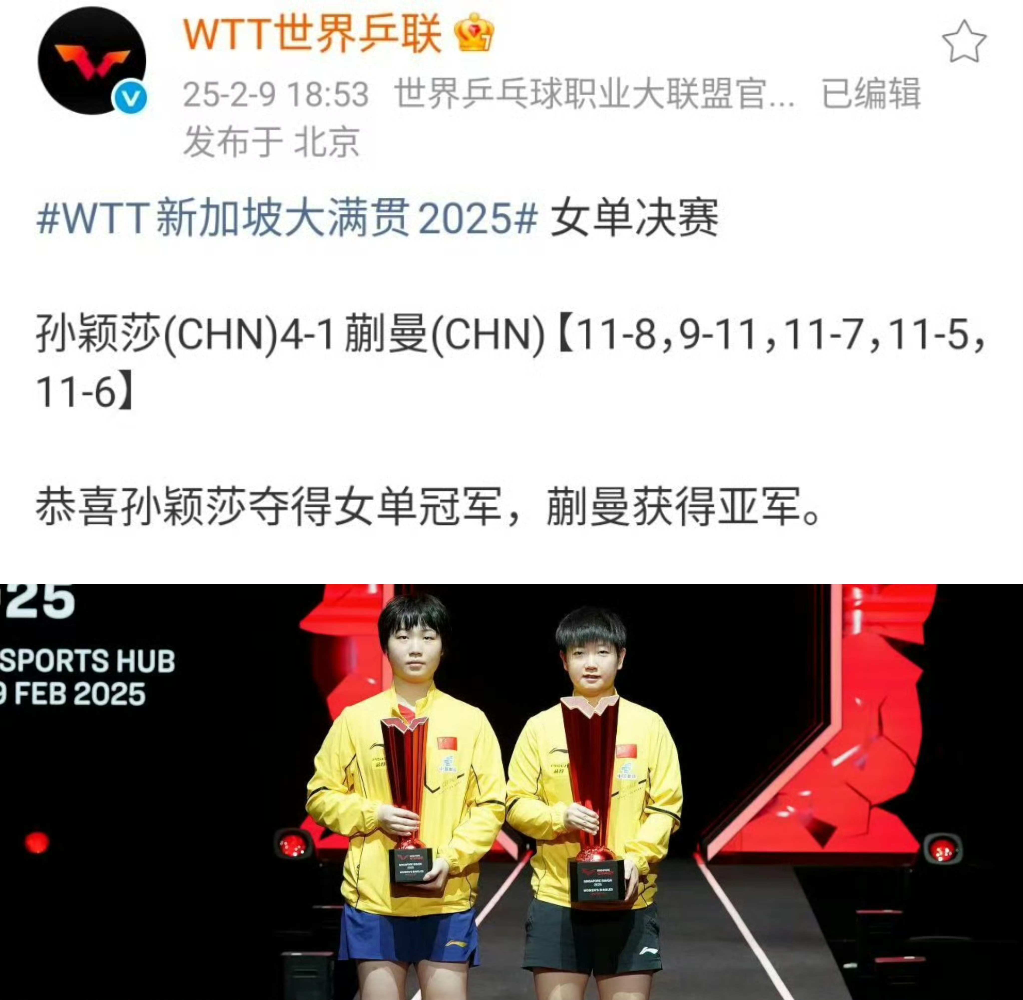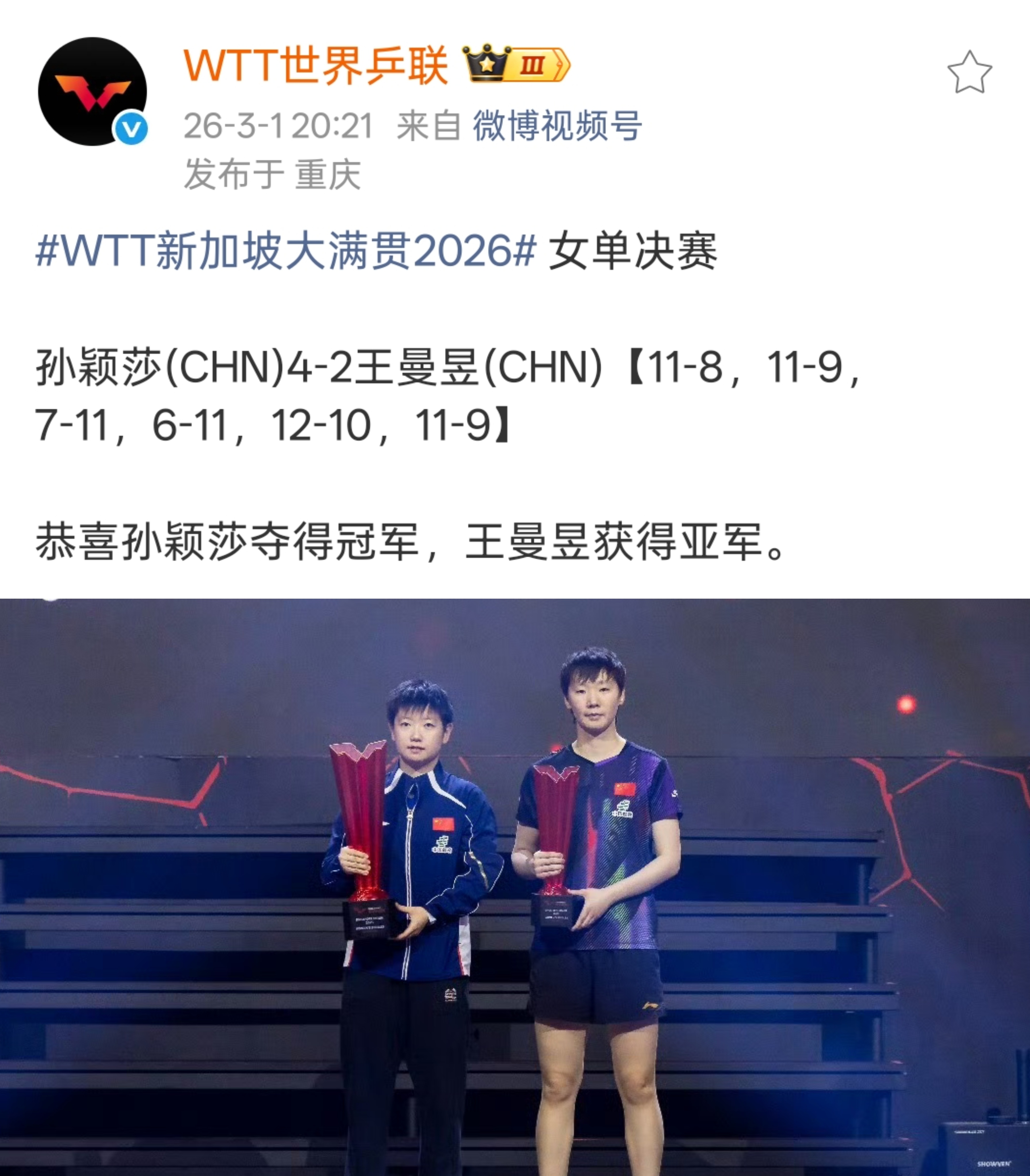 孙颖莎4比2王曼昱职业生涯截止到2026.3.1孙颖莎WTT大满贯赛事收获单打5️⃣冠1️⃣2023WTT新加坡大满贯女单冠军🏆决赛 孙颖莎🇨🇳4-1钱天一🇨🇳2️⃣2024WTT中国北京大满贯女单冠军🏆决赛 孙颖莎🇨🇳4-2王曼昱🇨🇳3️⃣2025WTT新加坡大满贯女单冠军🏆决赛 孙颖莎🇨🇳4-1蒯曼🇨🇳4️⃣2025WTT瑞典大满贯女单冠军🏆决赛 孙颖莎🇨🇳4-2王曼昱🇨🇳5️⃣2026WTT新加坡大满贯女单冠军🏆决赛 孙颖莎🇨🇳4-2王曼昱🇨🇳