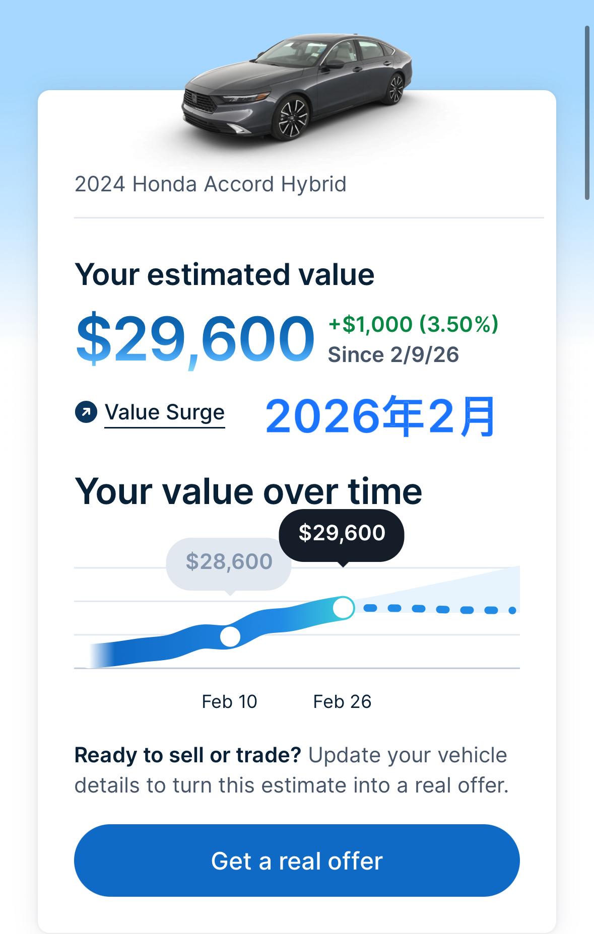 今天收到Carvana的短信,我手里这台2024款2.3万公里的顶配雅阁收车价29600刀,和去年4月给我的offer只差1600刀。按我提车落地价3.7万刀来算,这车裸车价也就3.4万刀,买了两年半,残值还有87%,保值率着实恐怖。把这车卖了去买国内的PHEV版雅阁,在配置不降级、电池容量翻16倍的前提下兜里还能剩个八千刀。没有经历过的人确实无法想象美国车市的魔幻。【来自懂车帝车友圈】