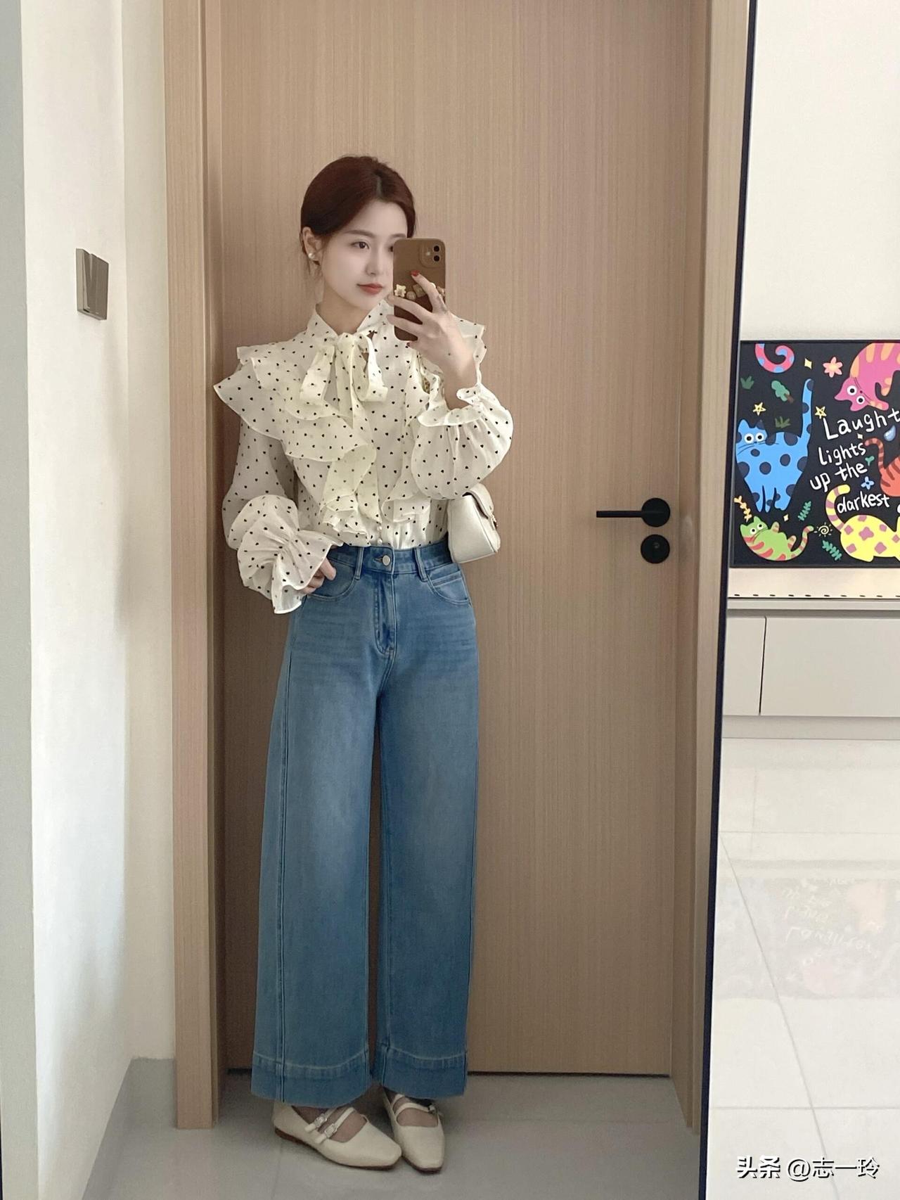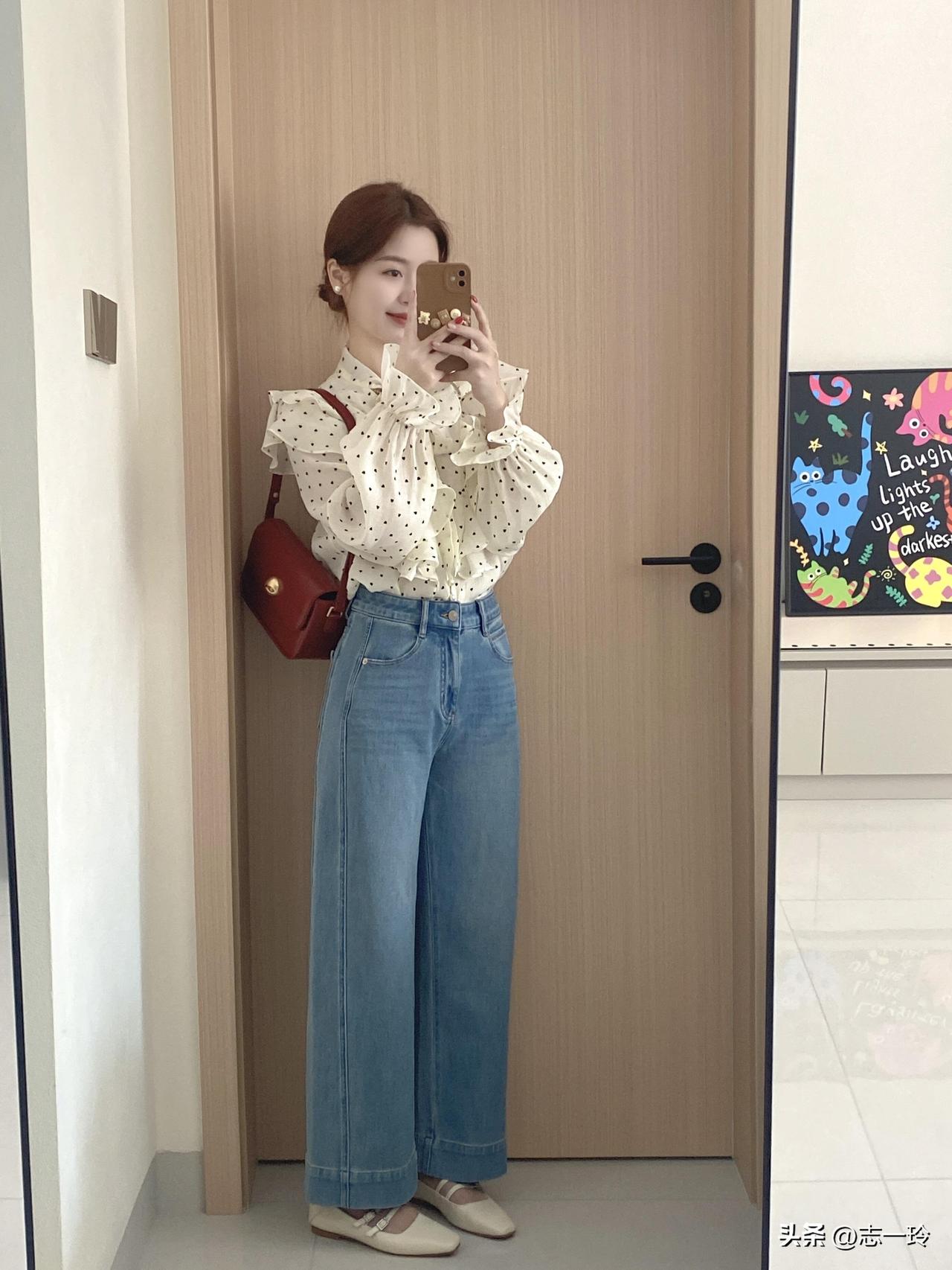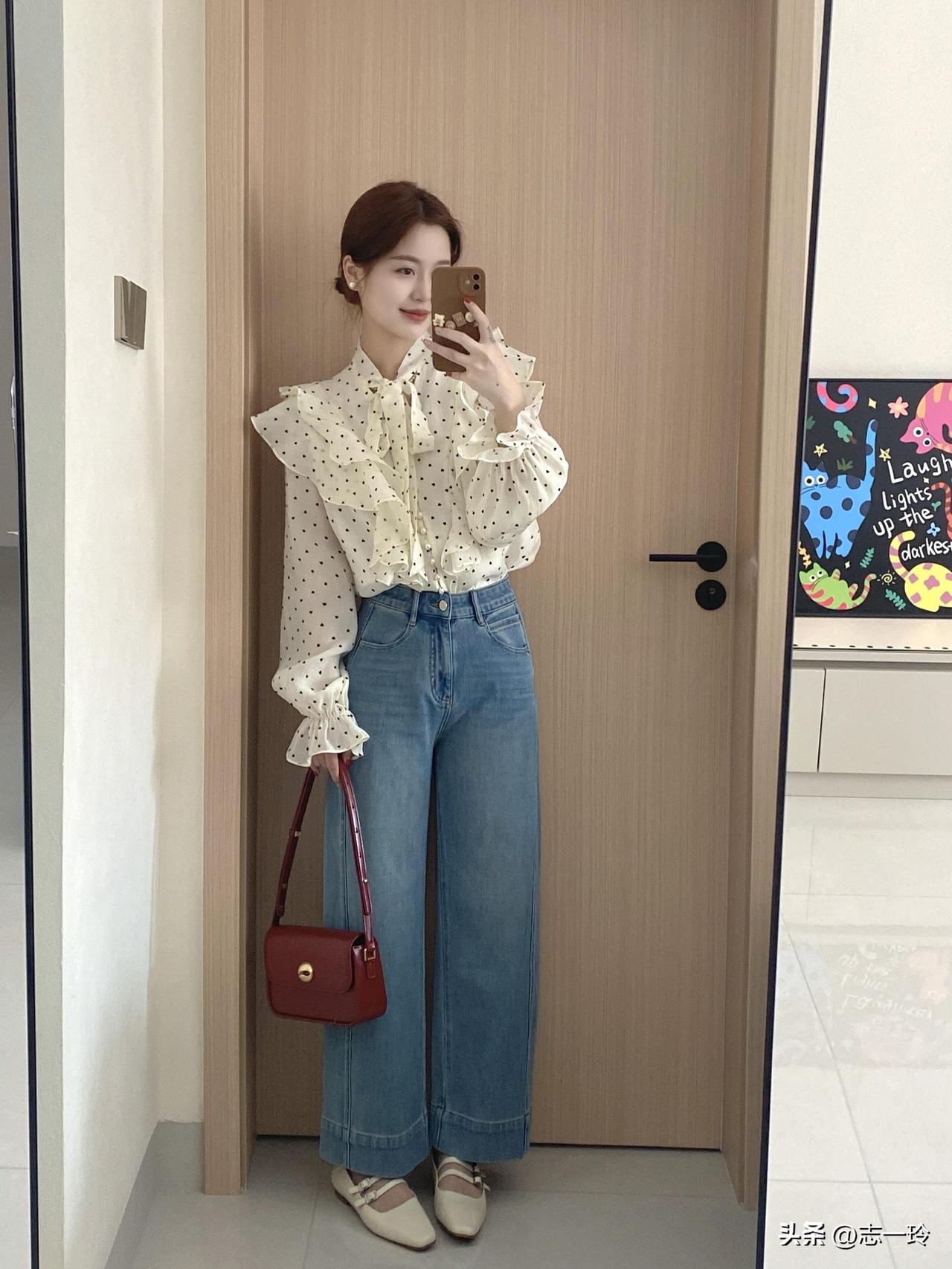 温柔甜美的穿搭,白色波点衬衫+高腰牛仔裤,清新自然!