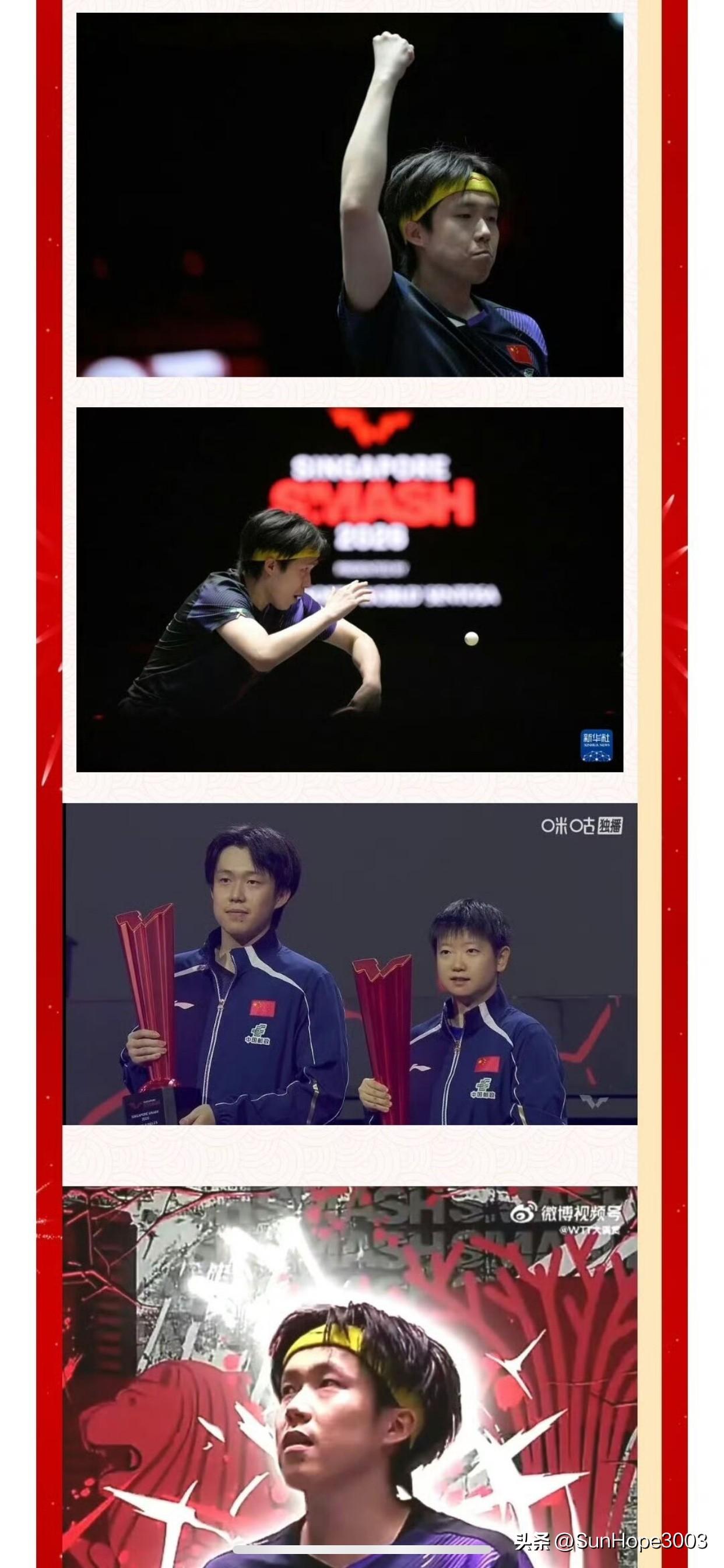 王楚钦夺得新加坡大满贯男单冠军,先农坛发喜报! 刚刚结束的新加坡大满贯,孙颖莎夺得女单冠军,王楚钦夺得男单冠军, 比赛一结束,先农坛就发了喜报,所以,大家不管是不是周末,是不是在上班, 都在等着呢,加班也开心。 选了4张照片,其中还有一张和莎莎和合照。 都是中国队的,发的没错。 再次恭喜莎莎楚钦!
