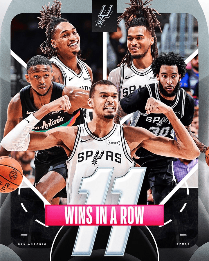 虎扑03月02日讯今日,NBA官方更新动态,晒出一张马刺的海报与球迷分享,并罗列了马刺的11连胜轨迹: