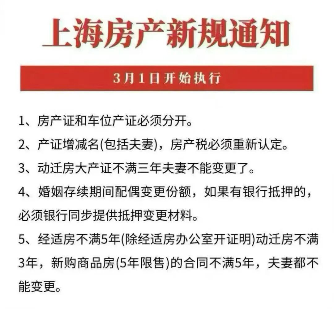 新规内容:经适房未满5年(无官方证明)、动迁房未满3年、新购商品房(5年限售)合同未满5年,这三类房产即便是夫妻间的产权变更,也一律不被允许。