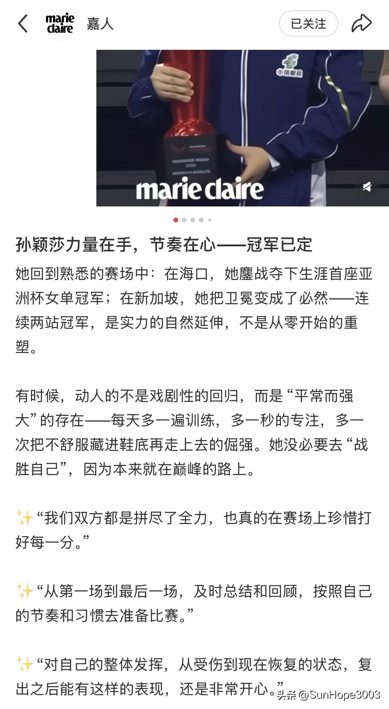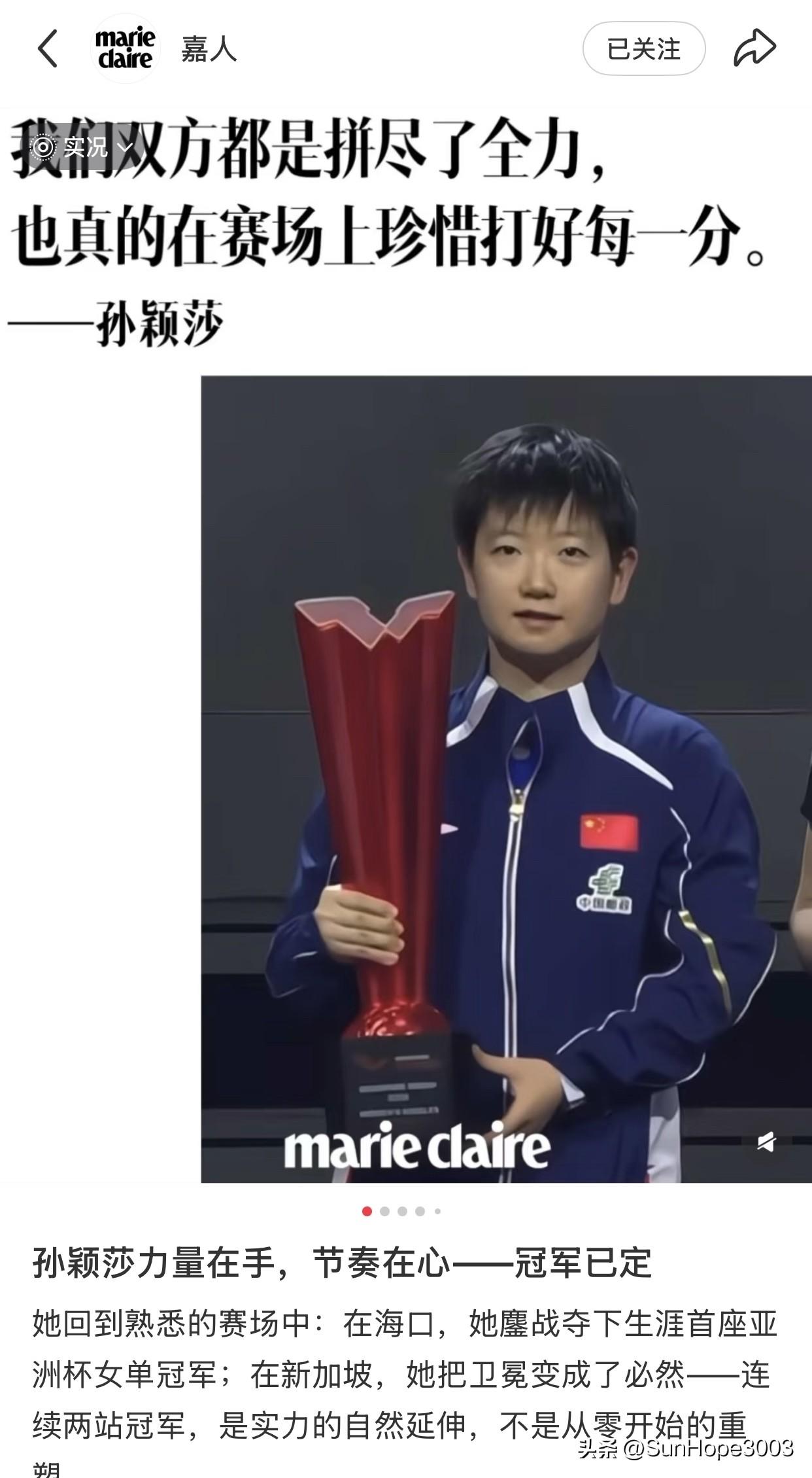 孙颖莎夺冠后,嘉人第一时间发文祝贺,ELLE立马投放大屏祝贺。 ELLE在孙颖莎新加坡大满贯夺冠后,立刻投放了莎莎的大屏, 这排面,也只有孙颖莎了。 嘉人第一时间发文,把莎莎在采访时的话语,提炼了一遍,表达着极大的认同和尊重。 而芭莎的主编亲自到现场观看莎莎的比赛。 能让合作过的顶级杂志都记住你,关注你,并且是一直关注,并且是每次关键时候都出来祝贺和力挺, 这只能说明这个小女孩是真的值得爱!