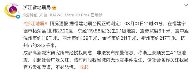 3月1日晚,不少浙江网友称,手机上弹出一则地震预警消息:21:31(融合网)浙江泰顺(E120.0,N27.4)附近发生4.2级左右地震。