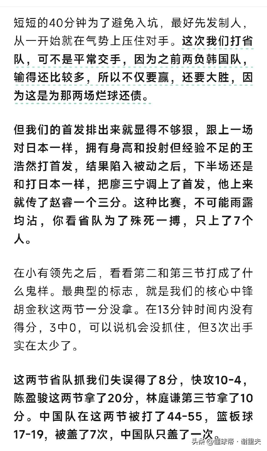 苏群看男篮角度真刁钻!不愧是篮球名嘴,他提出来:郭士强派出首发不够狠,王浩然上来就送分,这种比赛不可能雨露均沾,给12人亮相机会;恕我直言,省队无非就是7人轮转,而中国队当首发王浩然,替补焦泊乔和张镇麟上场这段时间,三个人拿2分,包括王浩然上来就像打日本防渡边一样送分,导致开局挖坑,而焦泊乔一上来就失误送刘铮中场三分反超1分,张镇麟更像惊弓之鸟,背打比他矮两头的陈盈俊使用后仰跳投,躲着打