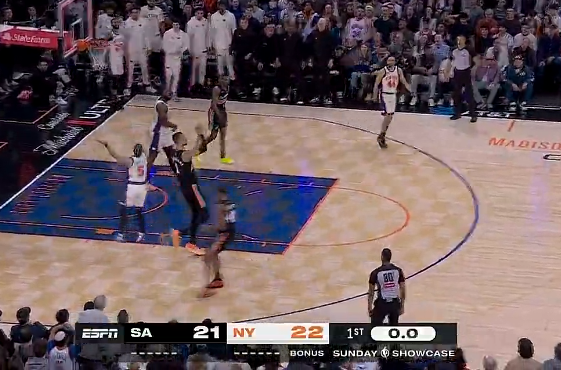 布伦森撤步三分不中,马刺首节比赛以21-22落后尼克斯