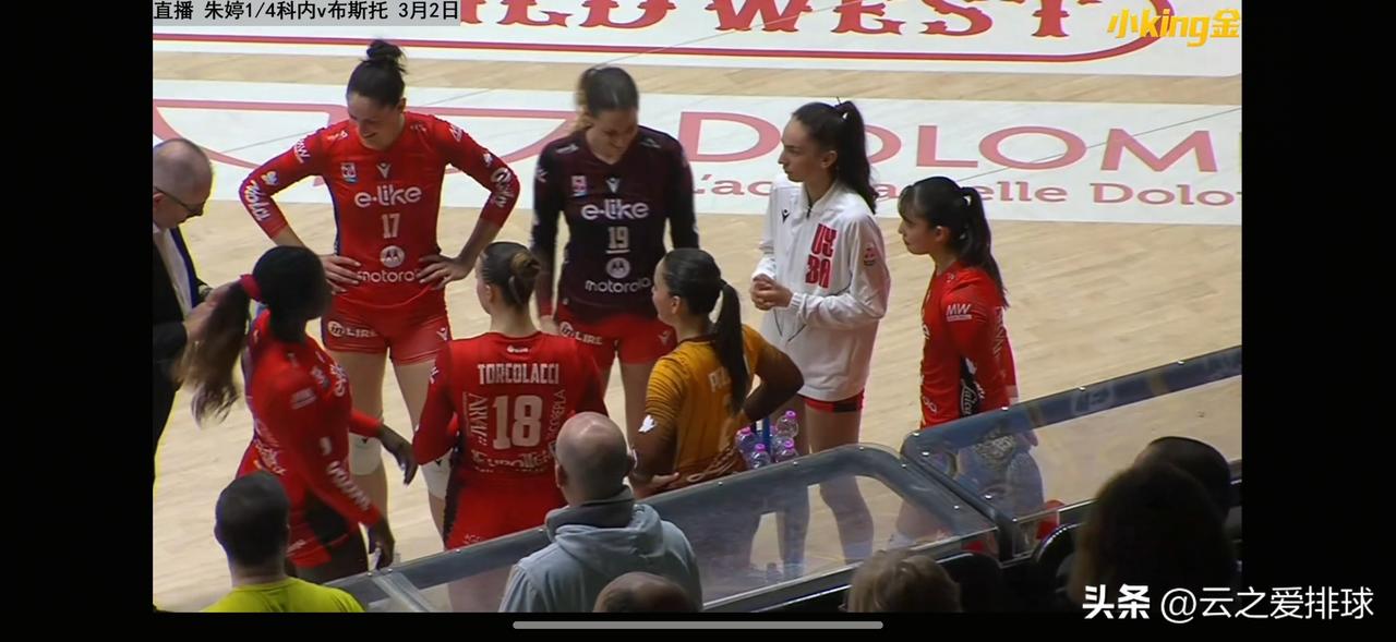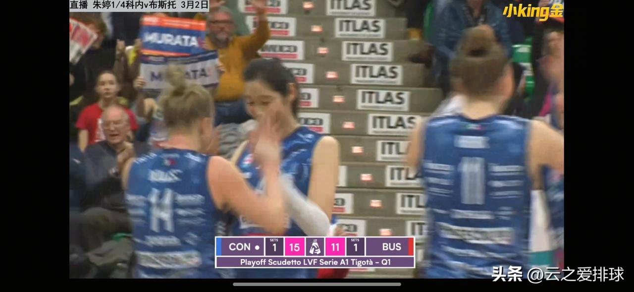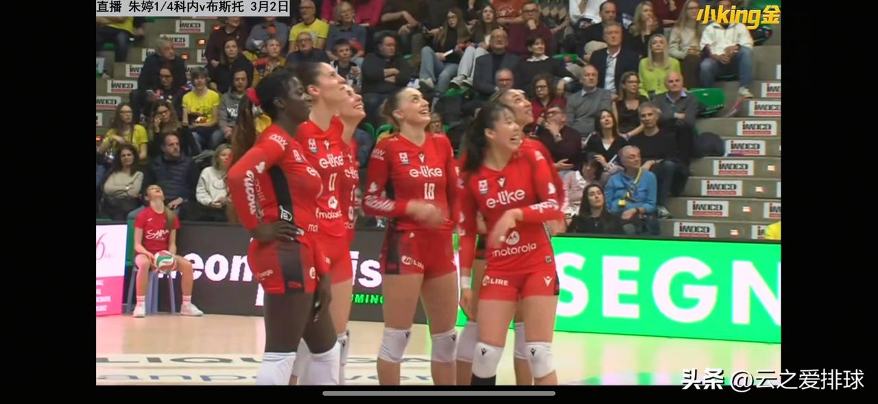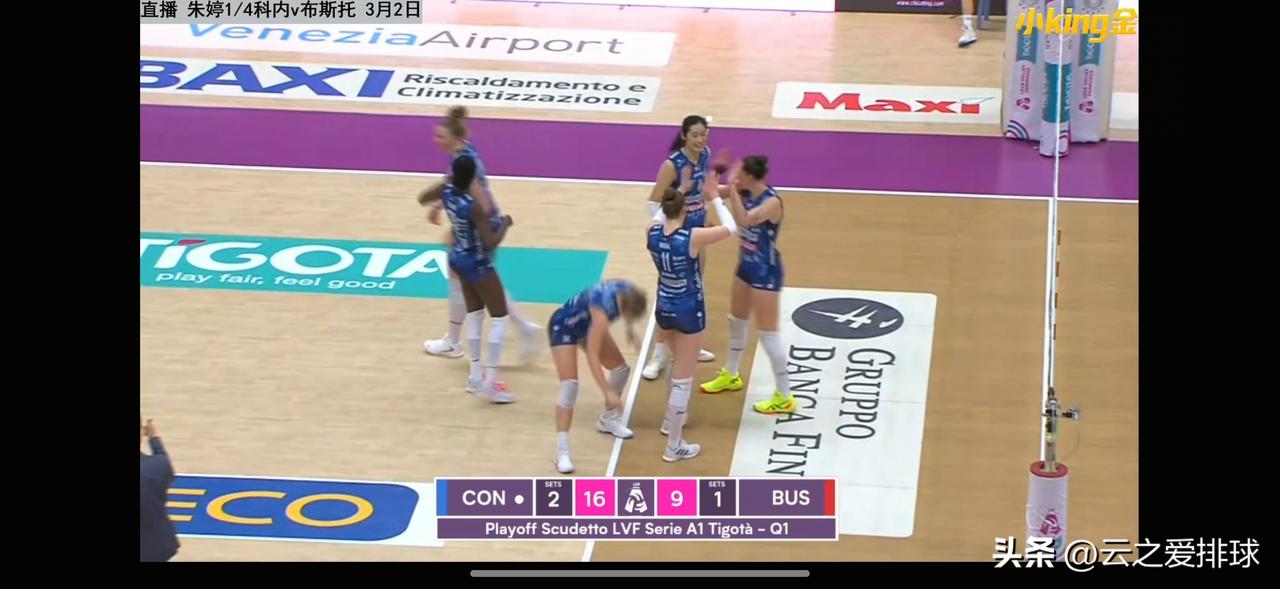 科内1/4决赛主场迎战布斯托! 首回合,没有看到像常规赛2场5局大战。今天科内有点省体力3:1力克布斯托,迎来1/4首场开门红。 别看布斯托排名第8,面对排名第一的科内,发球和防守真不差。 尤其第二局,加比和朱婷的一传都被冲击。桑塔雷利索性同时两名主攻同时替换。前面用西拉换下进攻不佳的加比,后排用尼卡置换朱婷,节省朱婷的体能。 今天三叉戟组合哈克状态爆棚,朱婷进攻犀利。尤其第一局大婷拿到9分(12扣9中),最后一局关键分又以一个拦网结束。 哈克拿到全场最高分; 而朱婷应该拿到队内第二高分20分(33扣18中,1失误被拦,2拦),双率不错。 加比进攻低迷,但是发球和防守依然在线。第四局没有上场! 副攻进攻受限,但是第三局法尔一波发球轮,好像连卡6分。 意甲1/4决赛3场2胜制,次回合将移师布斯托主场。 期待科内再胜布斯托!